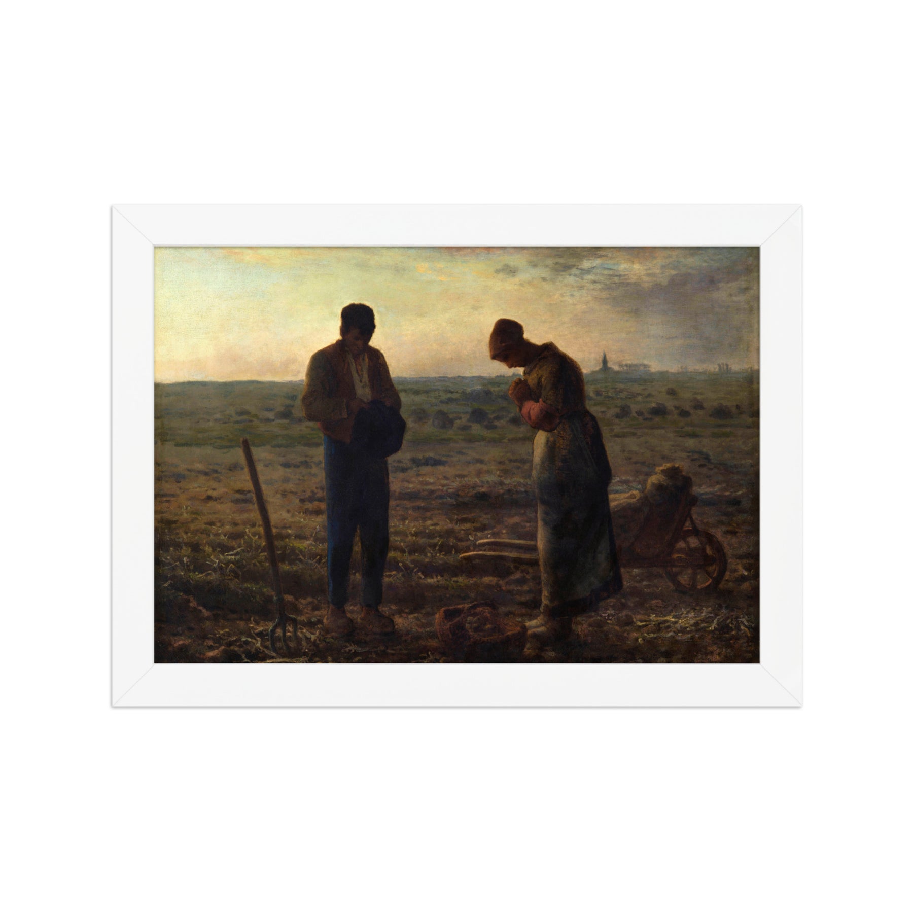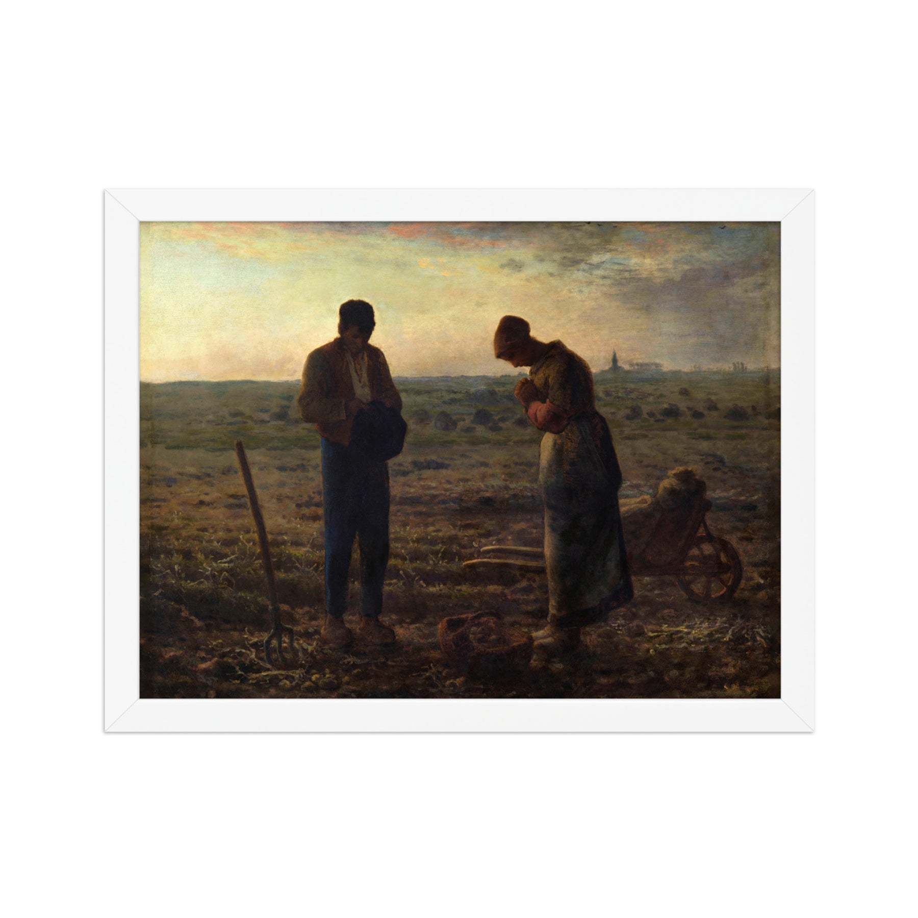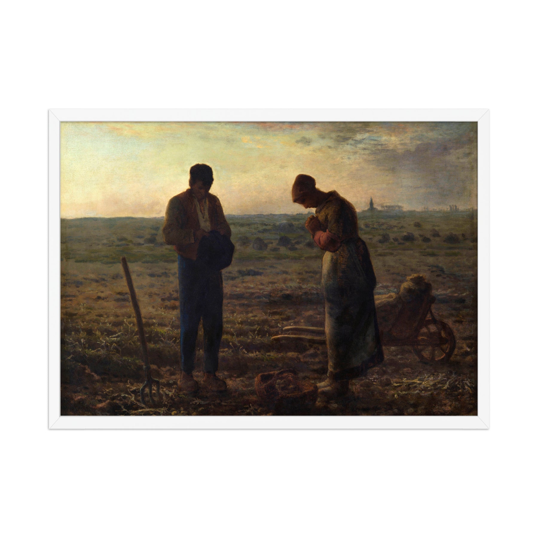 Mit L’Angelus schuf Millet eines der eindringlichsten Bilder des französischen Realismus. Auf einem abgeernteten Feld stehen ein Mann und eine Frau nebeneinander. Ihre Arbeitsgeräte – eine Schubkarre und ein Korb mit Kartoffeln – verweisen auf den soeben beendeten Arbeitstag. In der Ferne ragt der Turm einer Kirche auf, kaum mehr als eine Silhouette im Abendlicht.