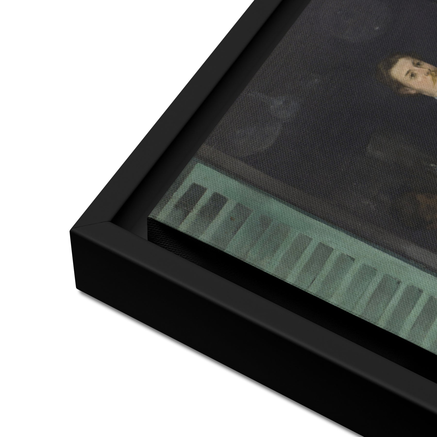 • Die gerahmten Leinwände mit braunen und schwarzen Rahmen haben eine schwarze Innenseite um die Leinwand und die Leinwände mit weißen Rahmen haben eine weiße Innenseite um die Leinwand.
