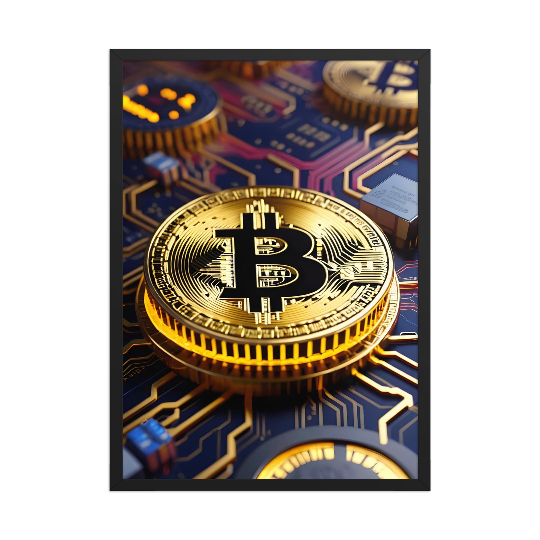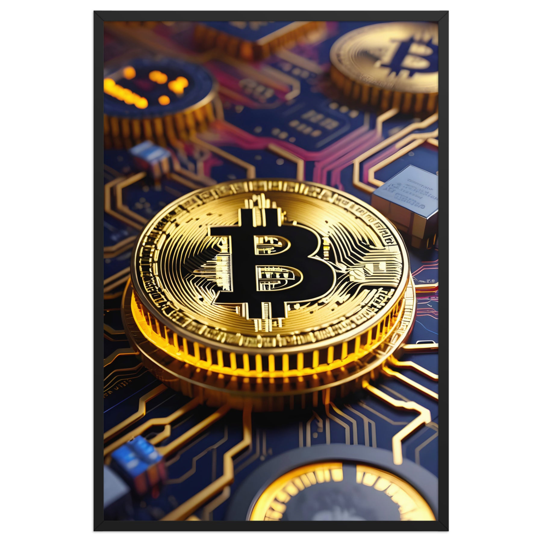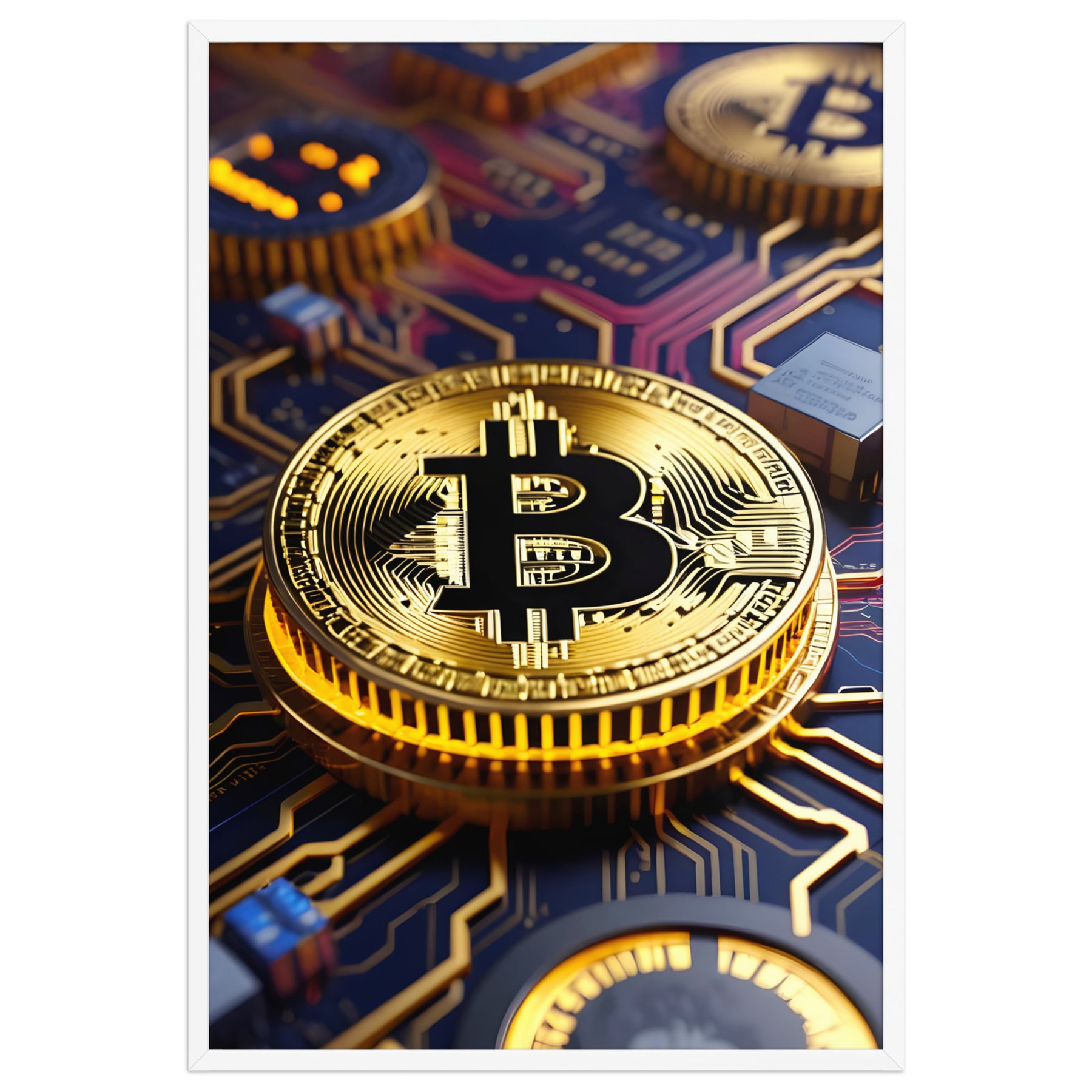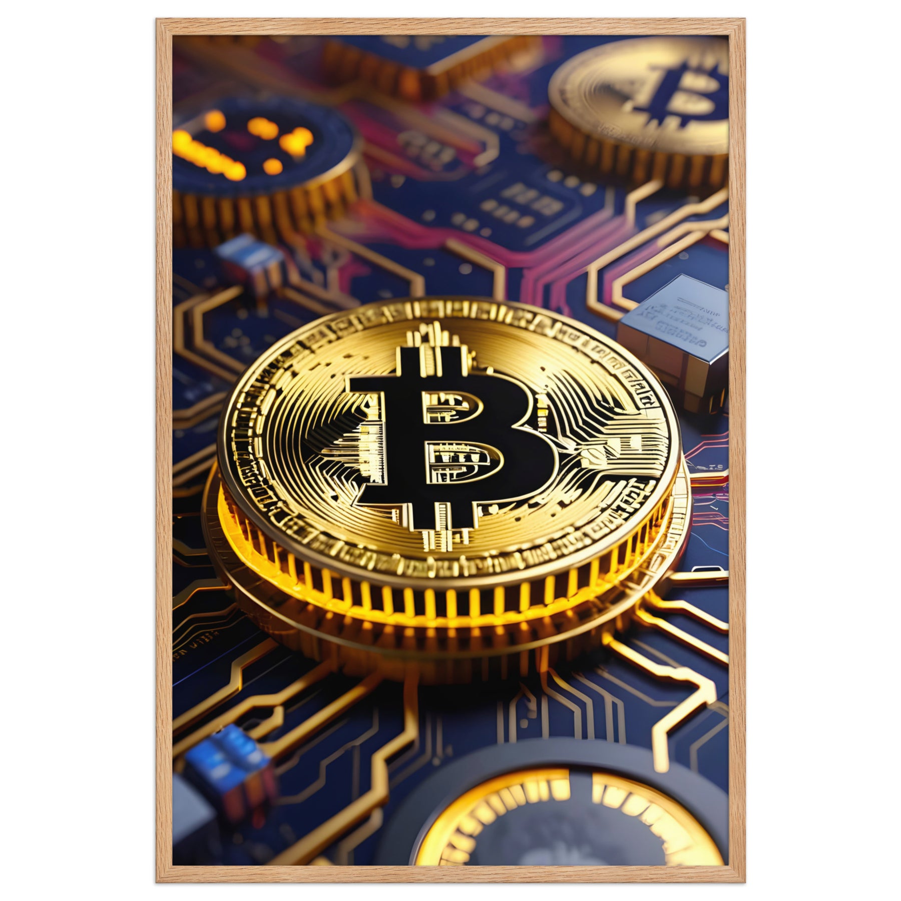 Le poster Bitcoin Circuit montre une pièce Bitcoin dorée détaillée avec le symbole distinctif ₿, intégrée dans un design fascinant de circuit imprimé. Cette composition relie le monde numérique de la technologie blockchain à la valeur intemporelle de l'or – un puissant symbole de la révolution dans le système financier mondial.