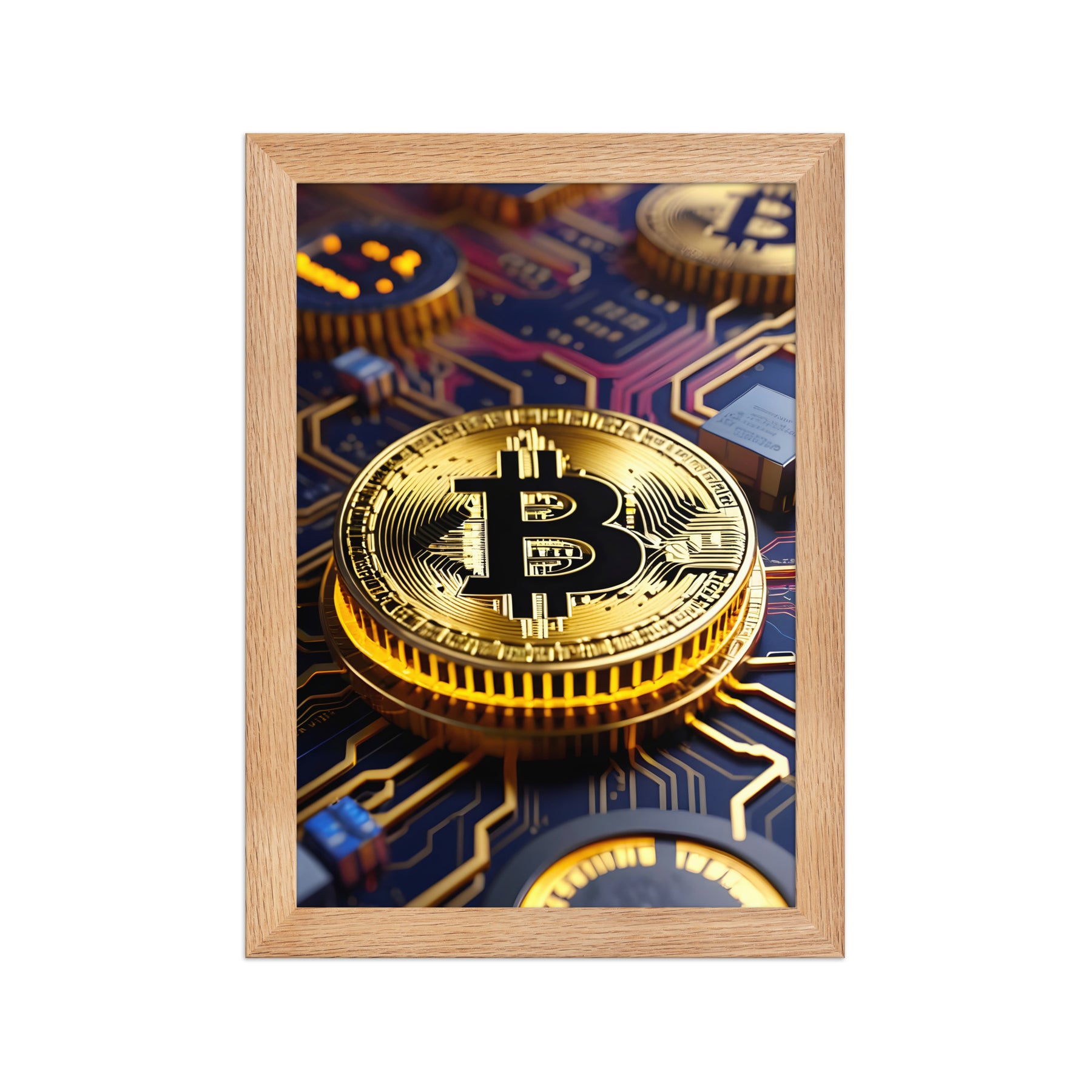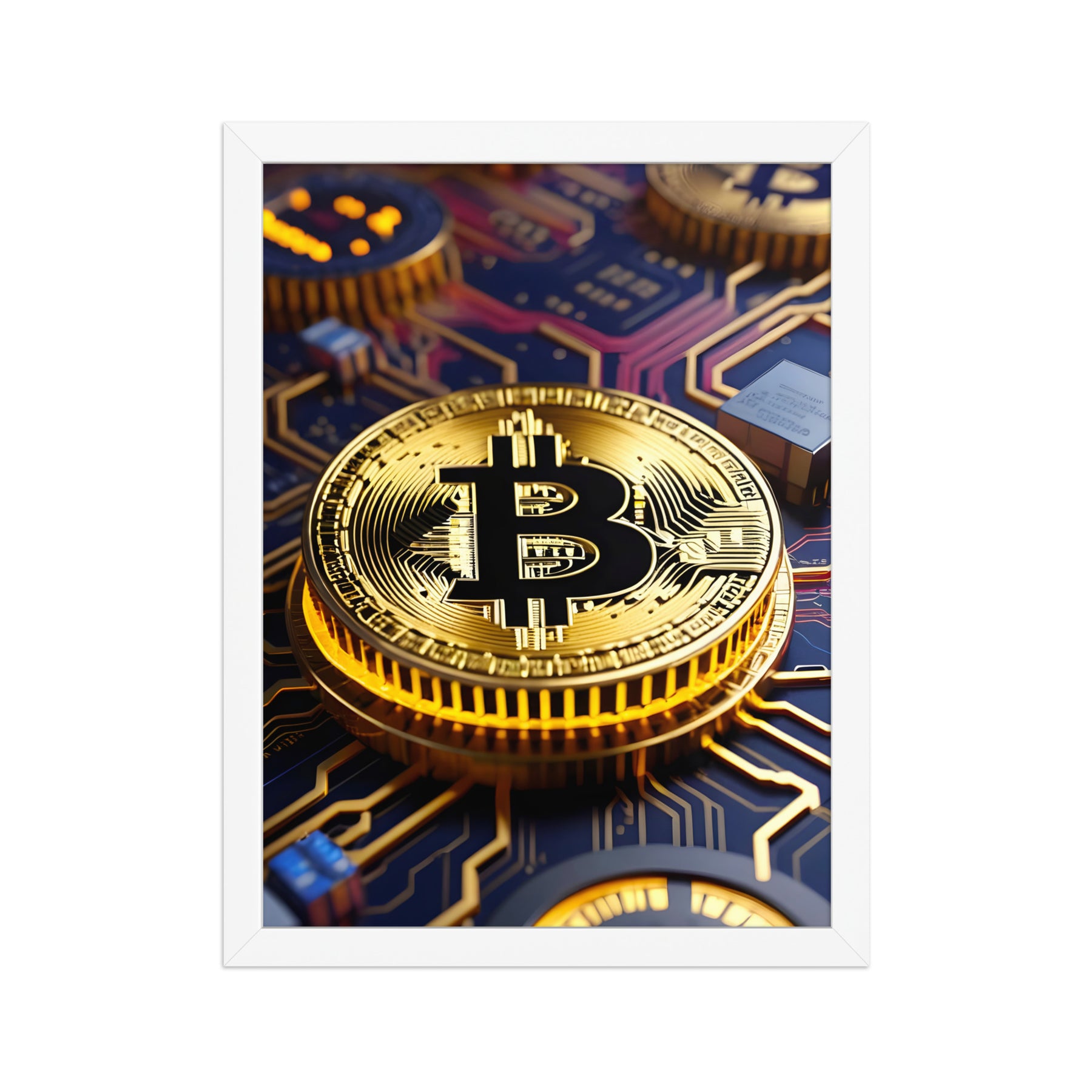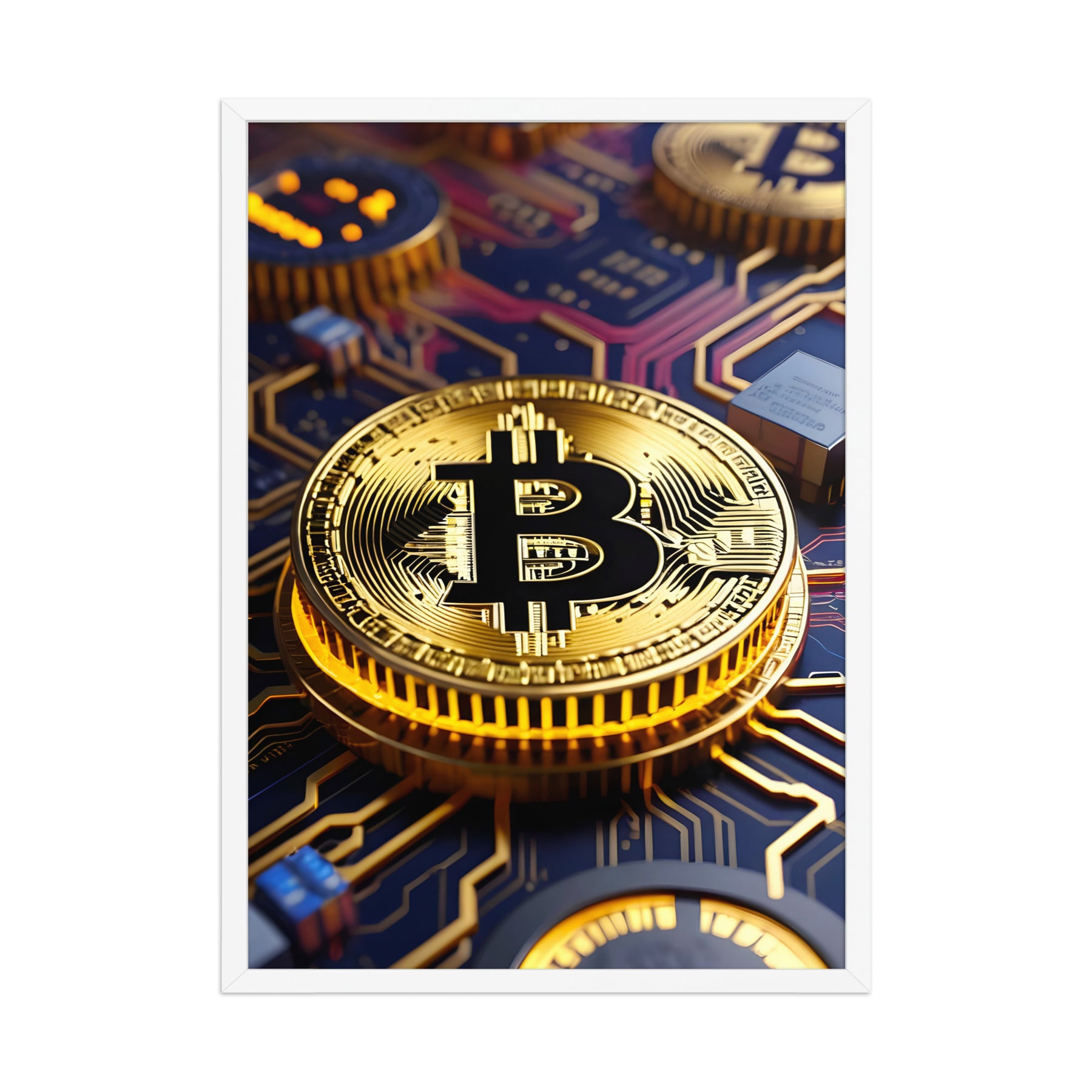Le poster Bitcoin Circuit montre une pièce Bitcoin dorée détaillée avec le symbole distinctif ₿, intégrée dans un design fascinant de circuit imprimé. Cette composition relie le monde numérique de la technologie blockchain à la valeur intemporelle de l'or – un puissant symbole de la révolution dans le système financier mondial.