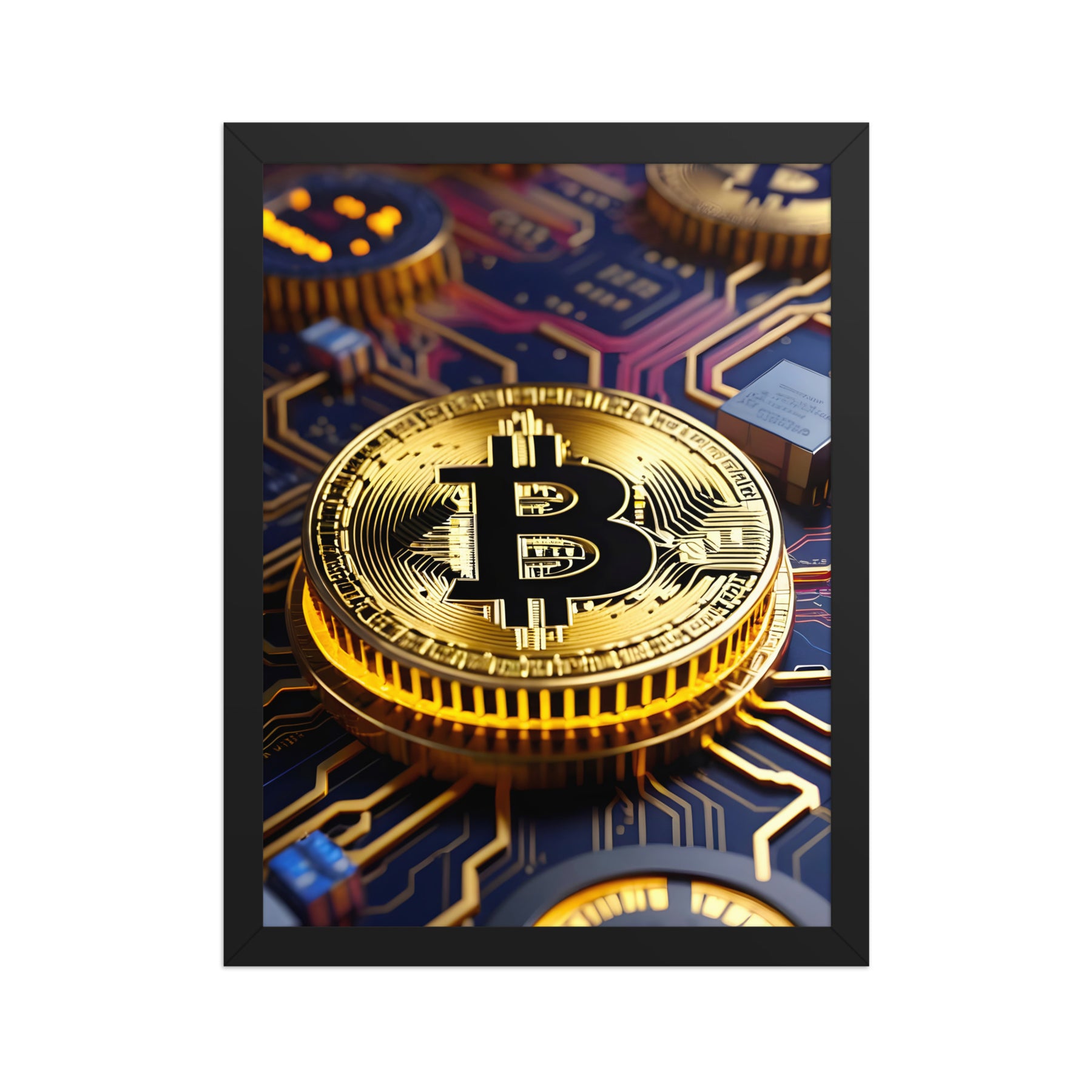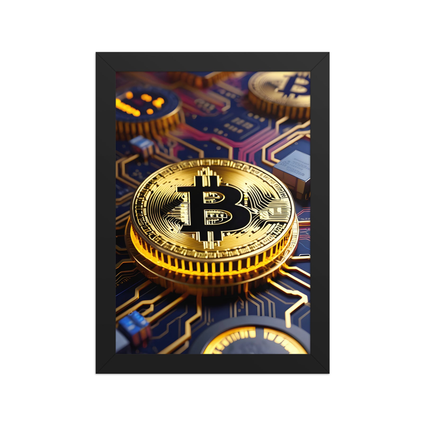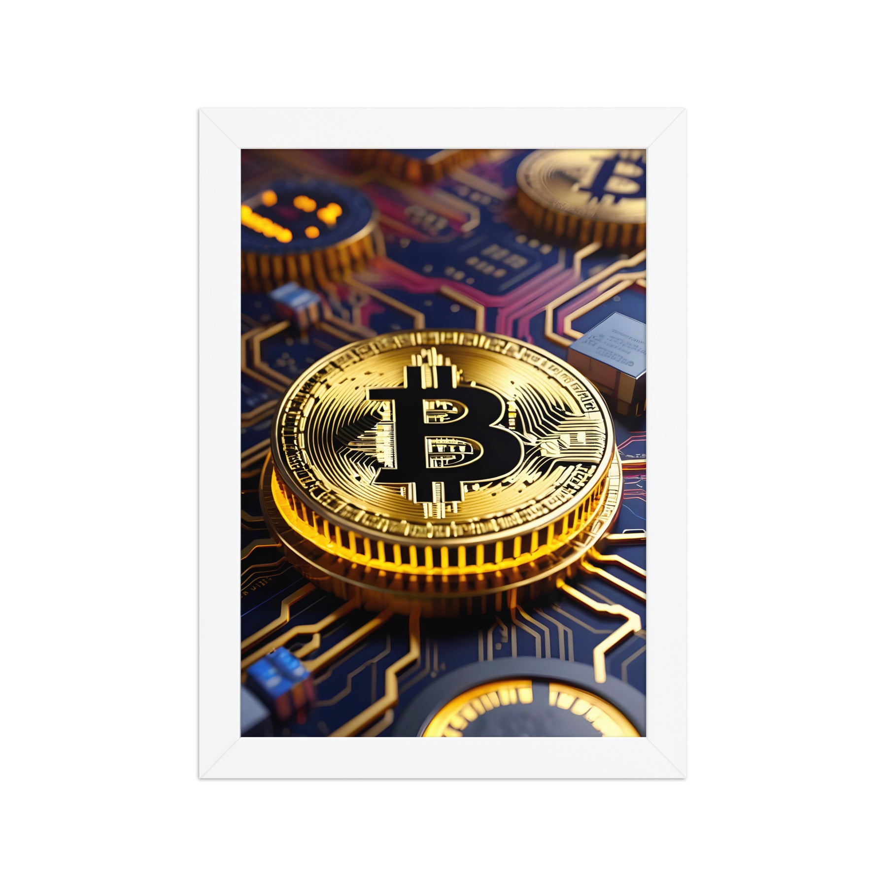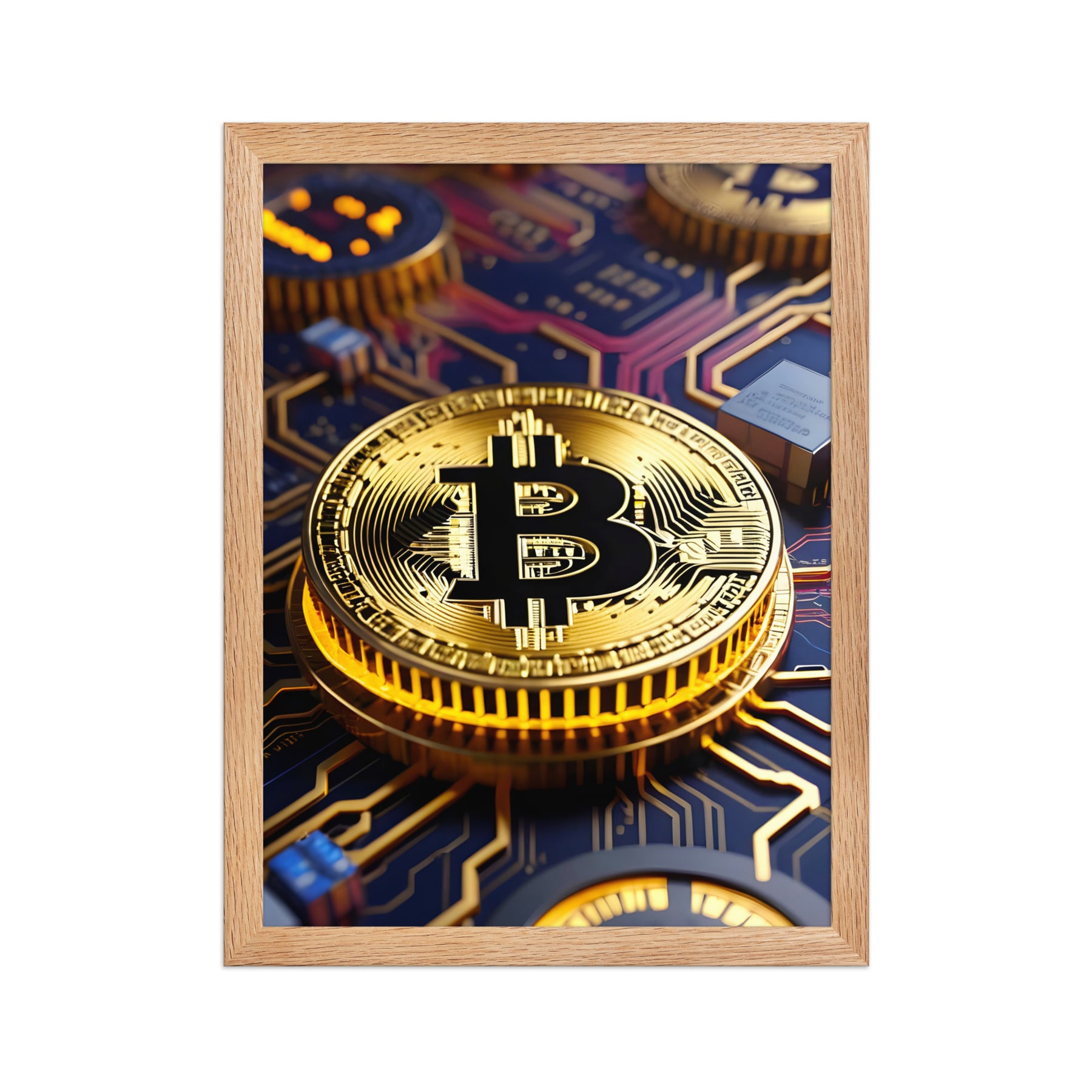 Le poster Bitcoin Circuit montre une pièce Bitcoin dorée détaillée avec le symbole distinctif ₿, intégrée dans un design fascinant de circuit imprimé. Cette composition relie le monde numérique de la technologie blockchain à la valeur intemporelle de l'or – un puissant symbole de la révolution dans le système financier mondial.