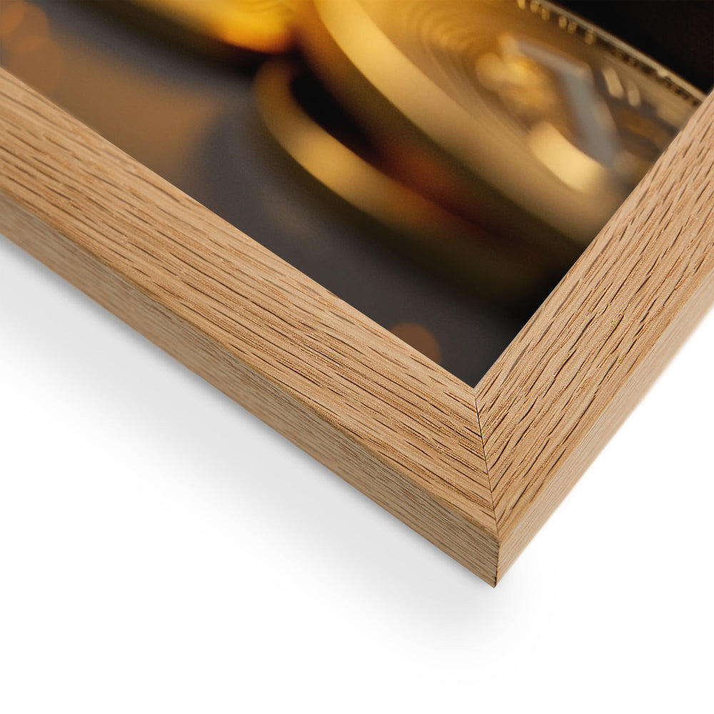 Cette œuvre murale de haute qualité montre une pièce de Bitcoin dorée photoréaliste au centre, entourée d'autres pièces qui s'estompent en arrière-plan. Les détails délicats et l'or brillant symbolisent la richesse, le succès des investissements et la fascination de la crypto art.