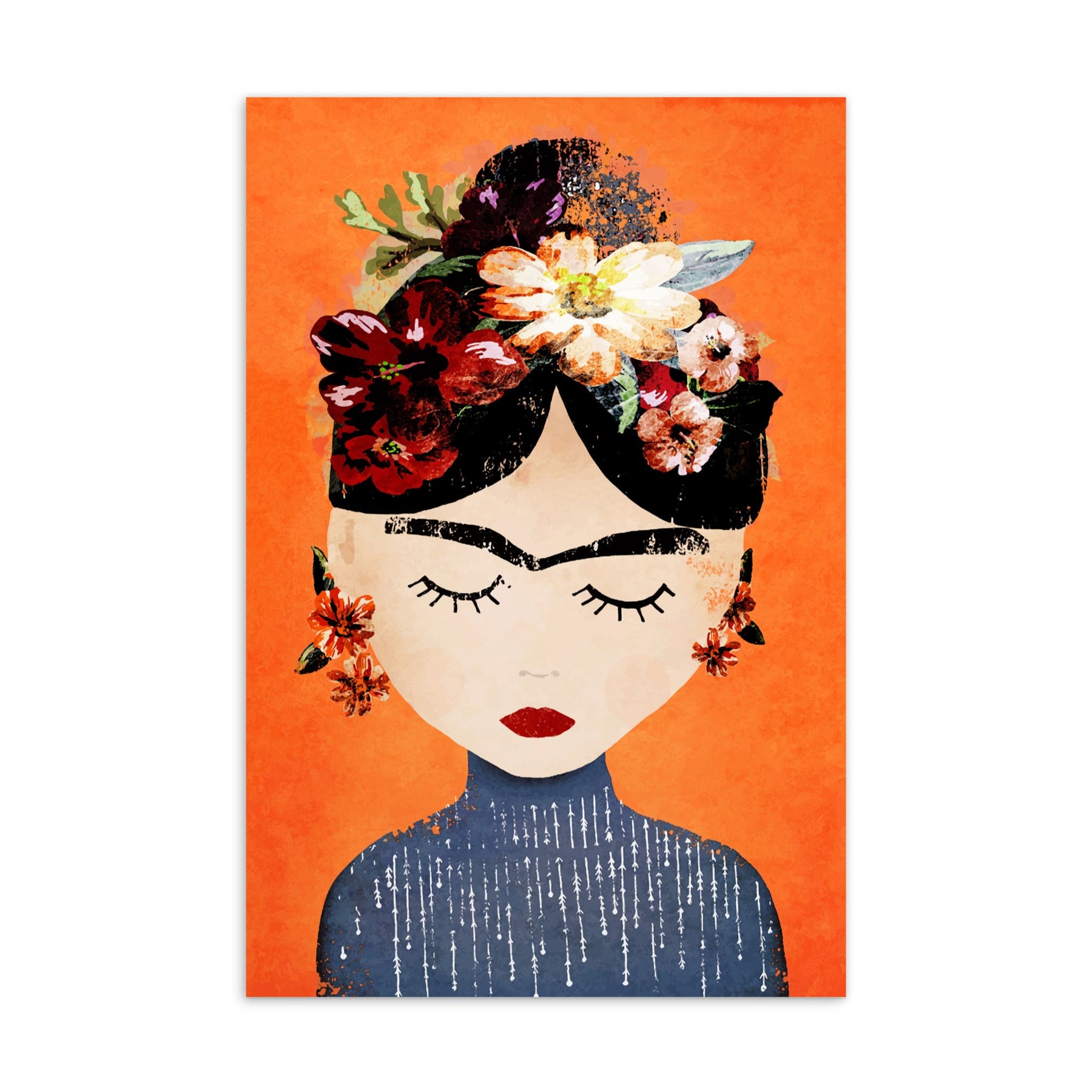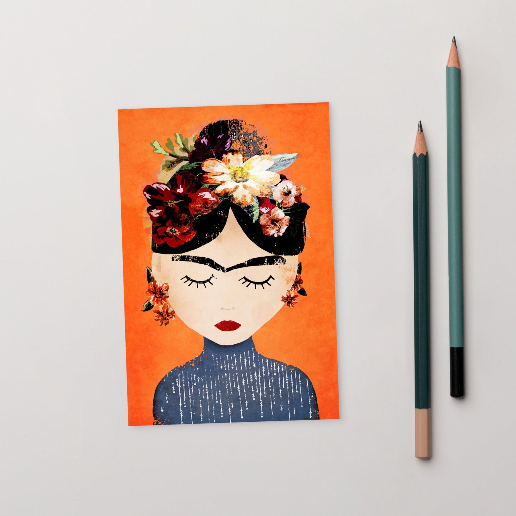 Cette carte postale - Frida Kahlo Orange est fabriquée à partir de papier mat épais et de haute qualité, ce qui en fait un cadeau optimal ou un moyen d'envoyer un message affectueux à un ami.