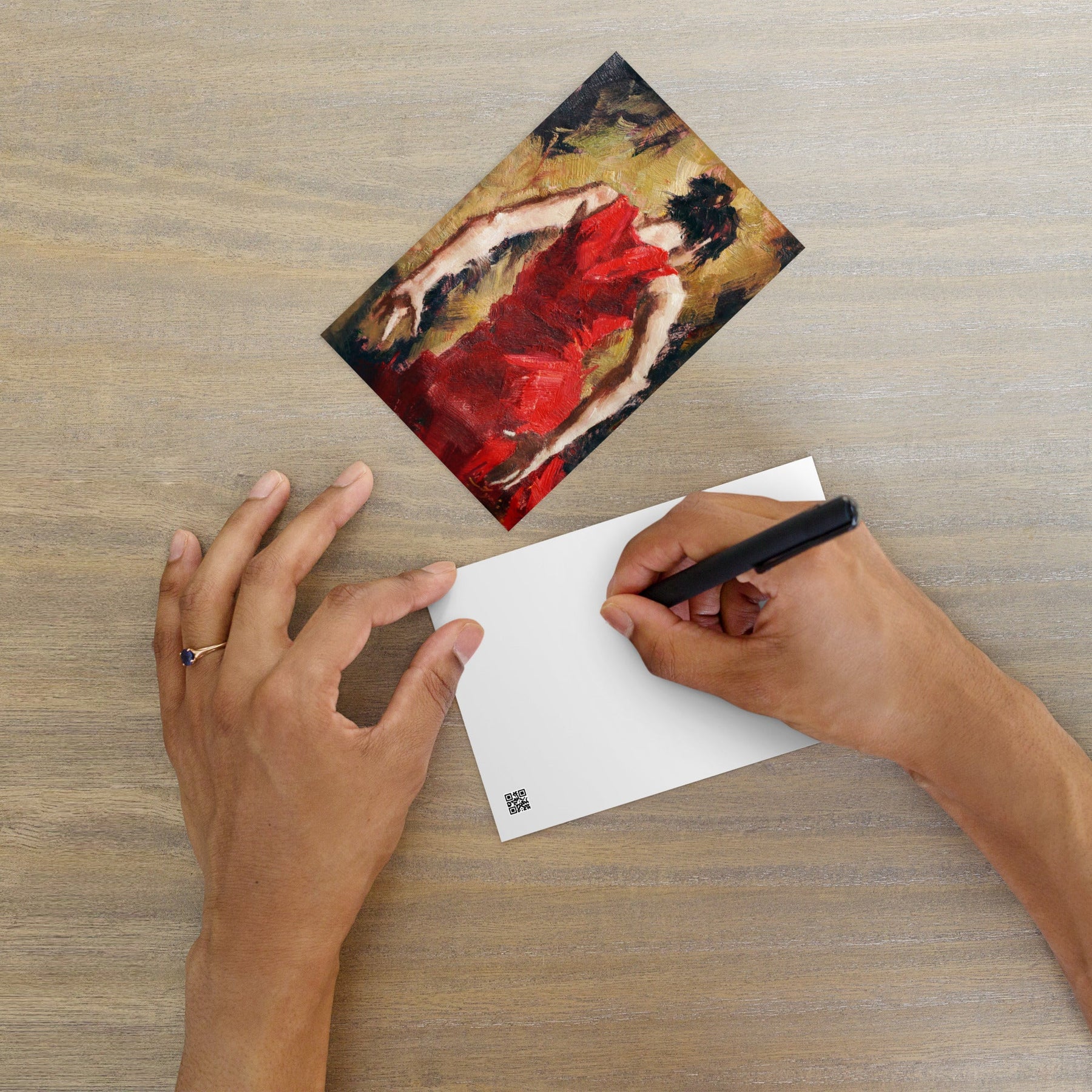 Cette carte postale - Tango Woman in Red Dress est fabriquée en papier mat épais et de haute qualité, ce qui en fait un cadeau optimal ou un moyen d'envoyer un message affectueux à un ami.