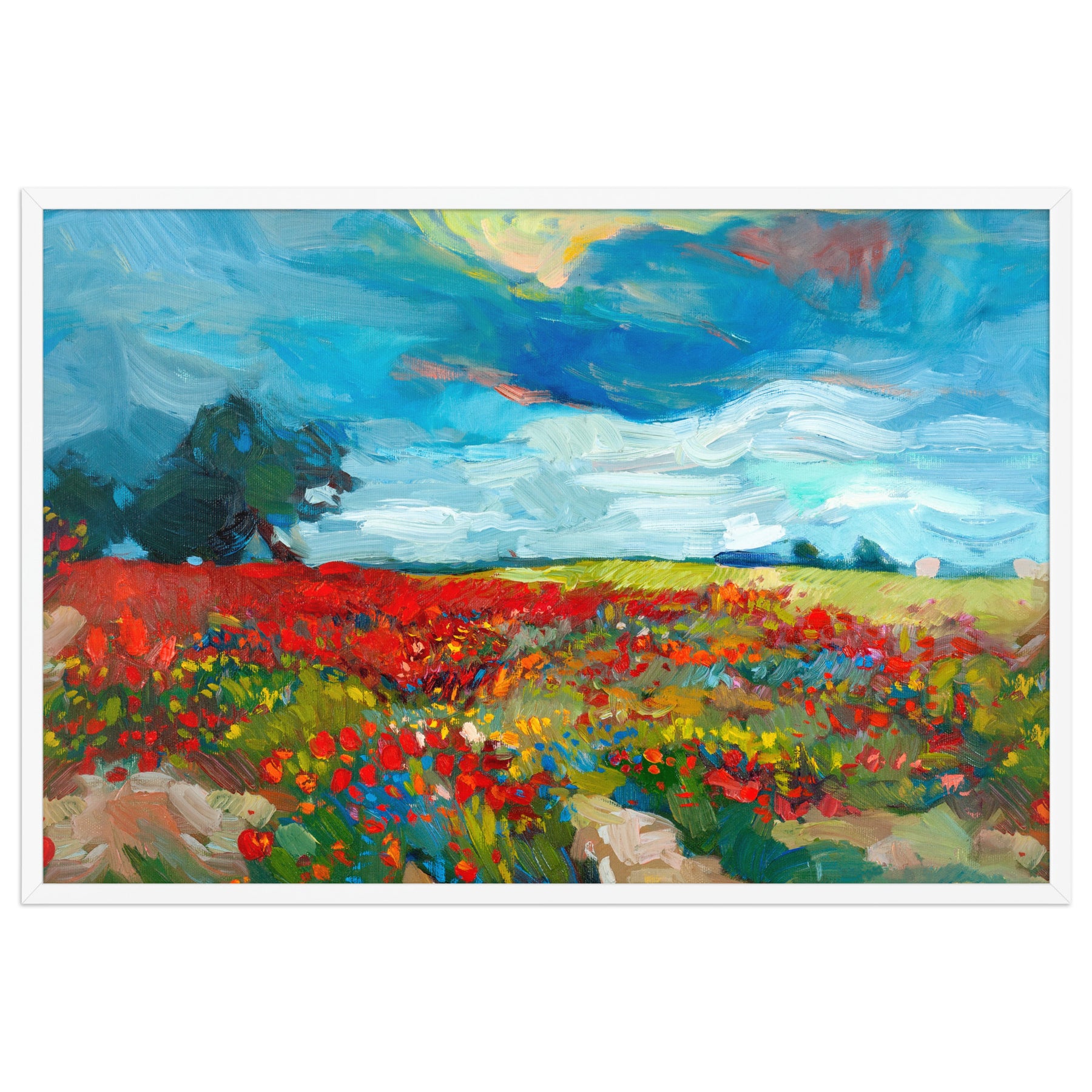 Questo dipinto murale "Campi di fiori", stampato su un poster, mostra un prato con innumerevoli fiori. La linea dell'orizzonte divide chiaramente l'immagine in due metà. La metà inferiore mostra un campo o un prato. Lì crescono fiori dai colori più vivaci, con il rosso che domina nettamente. Si vedono sparsi alcuni fiori blu, gialli e arancioni. Al bordo inferiore, al centro, è accennato un sentiero di campagna che ci invita a passeggiare attraverso il mare di fiori. Non è difficile immaginare la leggera brezza che fa ondeggiare fiori ed erba. Al centro dell'immagine vediamo un orizzonte chiaro. Lì c'è un albero storto che da innumerevoli generazioni resiste ai venti. Non possiamo vedere la fine del prato e così l'immagine crea una sensazione di infinito. Il cielo blu intenso attira maggiormente l'attenzione sulle pennellate curve. Queste ultime evidenziano la dinamica del cielo e mostrano la forza del vento che soffia sul campo. Alcune parti bianche dell'immagine suggeriscono nuvole e in alto vediamo un accenno di giallo. Sicuramente il sole illumina alcune nuvole. Nel complesso, il blu profondo del cielo crea un'atmosfera fresca. Anche il rosso dei fiori ha una componente blu e contribuisce a ciò.