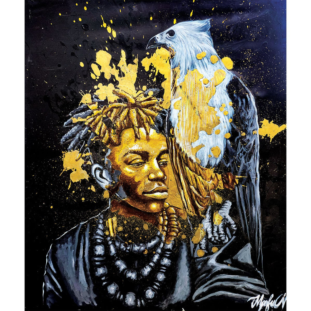 In "Royal Spirit (Il Principe Ereditario)" Nokuthula Mpofu cattura l'essenza della dignità reale e della connessione spirituale. L'opera mostra un giovane principe, il cui volto brilla di tonalità dorate, come se la luce della sua destinazione interiore si irradiasse verso l'esterno. Al suo fianco troneggia un maestoso pesce aquila africano — un simbolo di libertà, lungimiranza e potere.