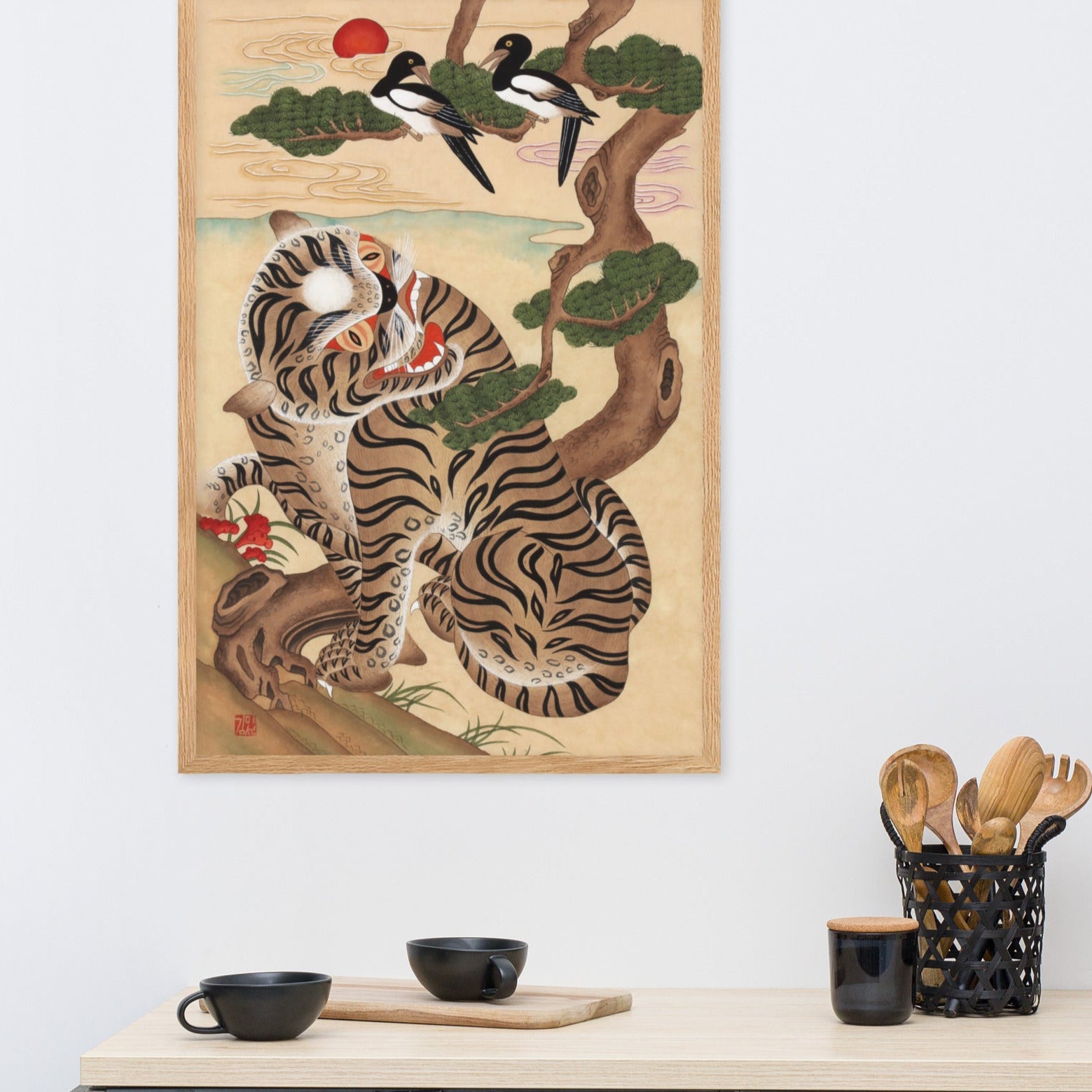 Questo murale stampato su poster "Tigre e Gazza" dell'artista coreana Misun Kim è un'opera d'arte asiatica classica estremamente rara al giorno d'oggi. Il murale è stato realizzato nel 2014, ma lo stile e il soggetto lo fondono con un'epoca artistica ormai passata. Vediamo innanzitutto la tigre, cui viene concesso molto spazio nell'opera a causa della sua imponente grandezza. Il colore del pelo e le strisce mimetiche la fanno fondere con lo sfondo. Solo gli occhi giallo-rossi luminosi e la lingua sporgono, facendoci intuire il ruggito dell'animale. Dietro la tigre si snoda un albero su cui sono sedute due gazze che guardano verso la tigre. Infine vediamo un sole intensamente rosso nel cielo, parzialmente velato da nuvole. Quasi invisibile, vediamo una sottile linea blu-verde che attraversa l'immagine. Immaginiamo che sia la riva di un lago in Corea, in un'epoca in cui la nostra civiltà, se mai esistesse, era ancora agli albori e non vi era alcuna influenza umana, poiché oggi non possiamo più trovare un soggetto simile nel mondo reale.