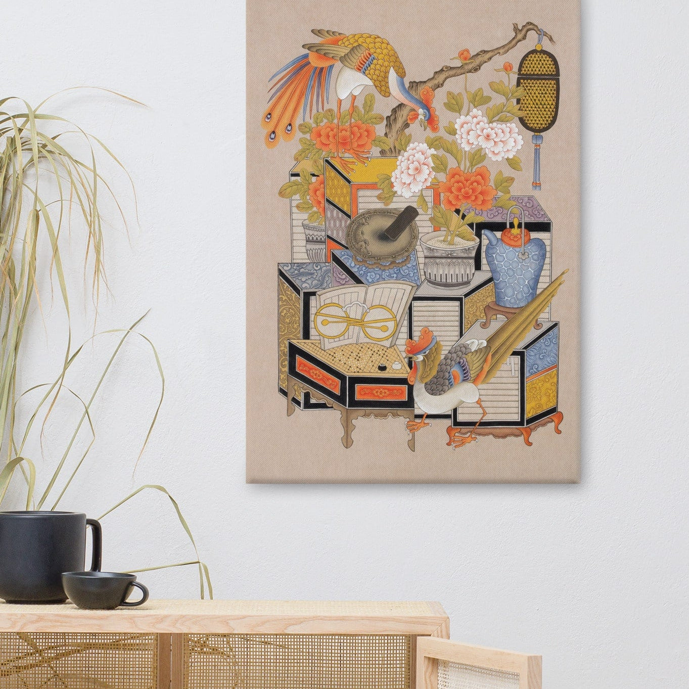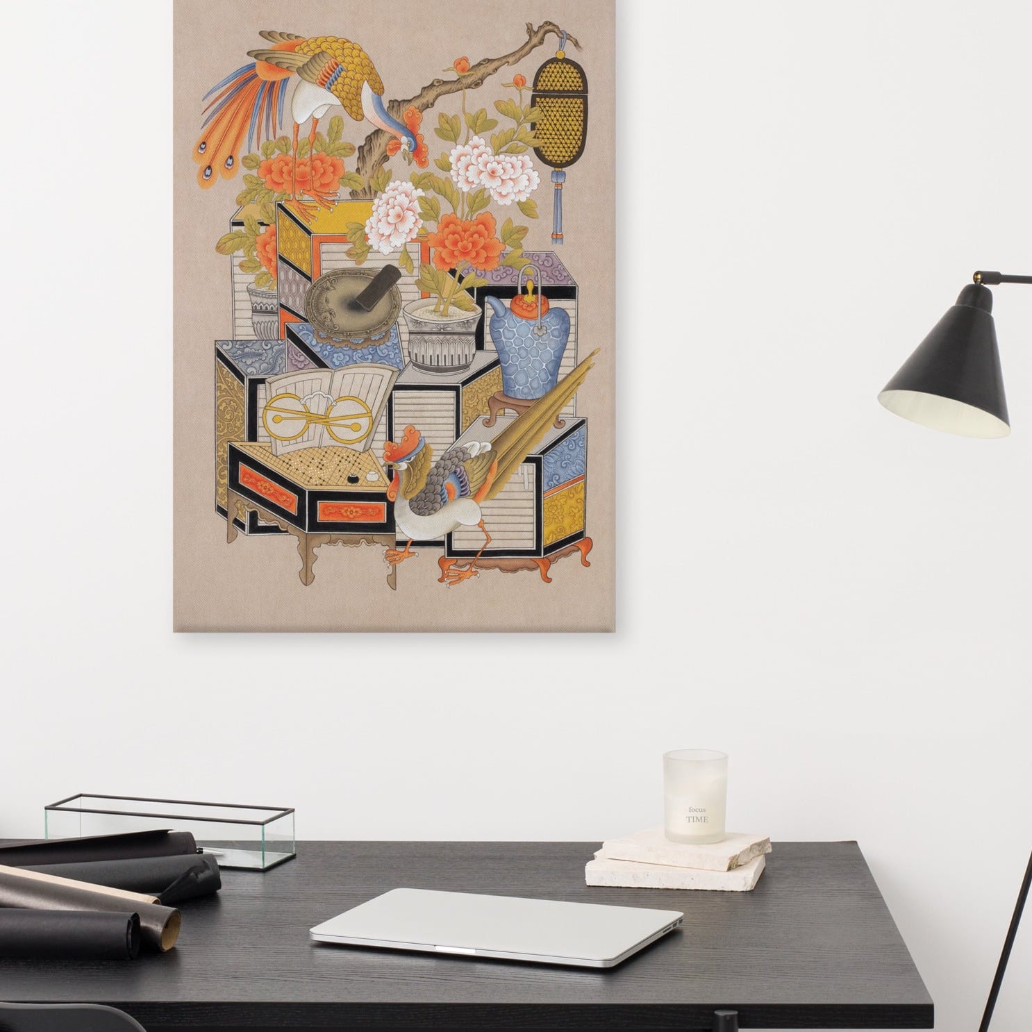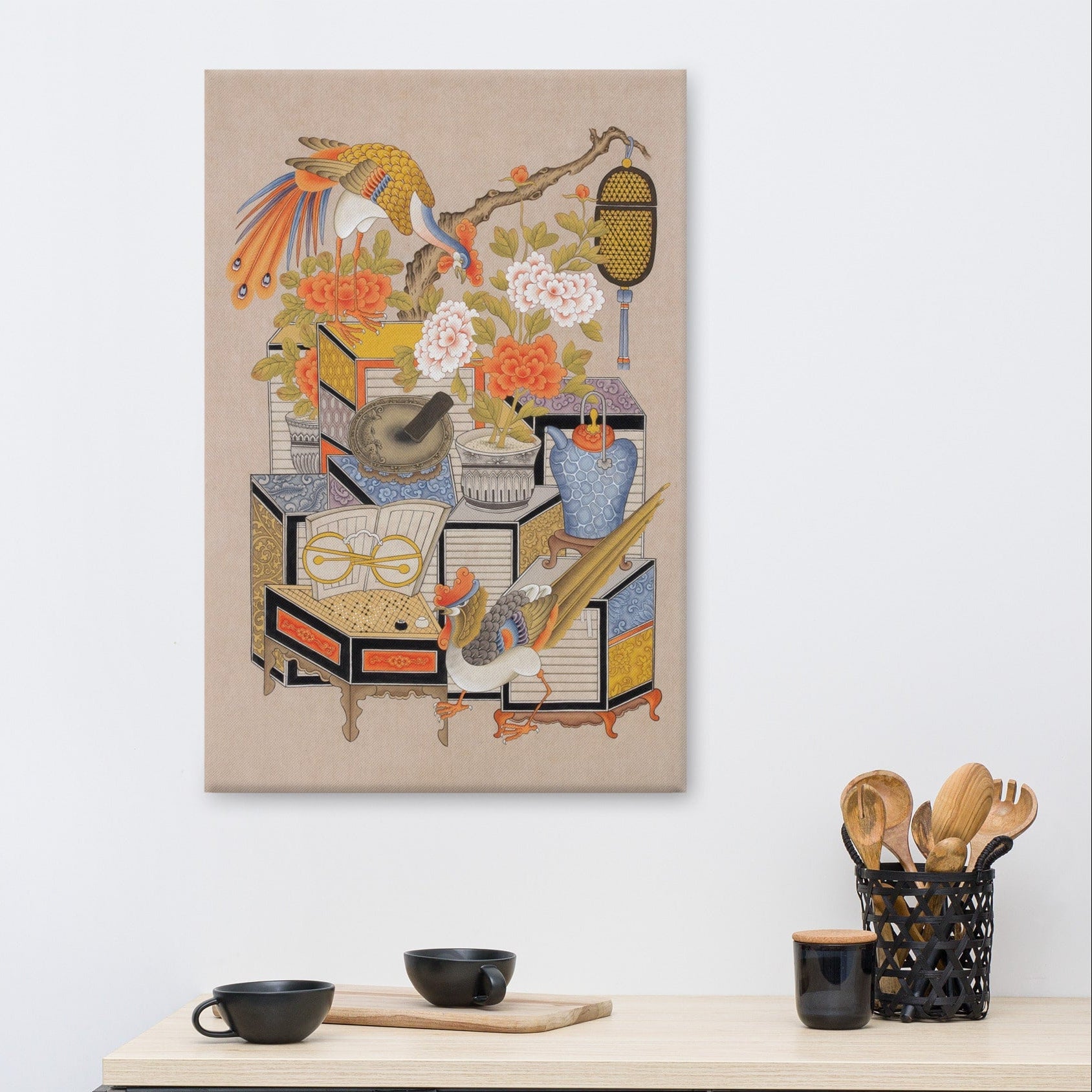 Diese Leinwandarbeit interpretiert das klassische Chaekgeori-Motiv neu.