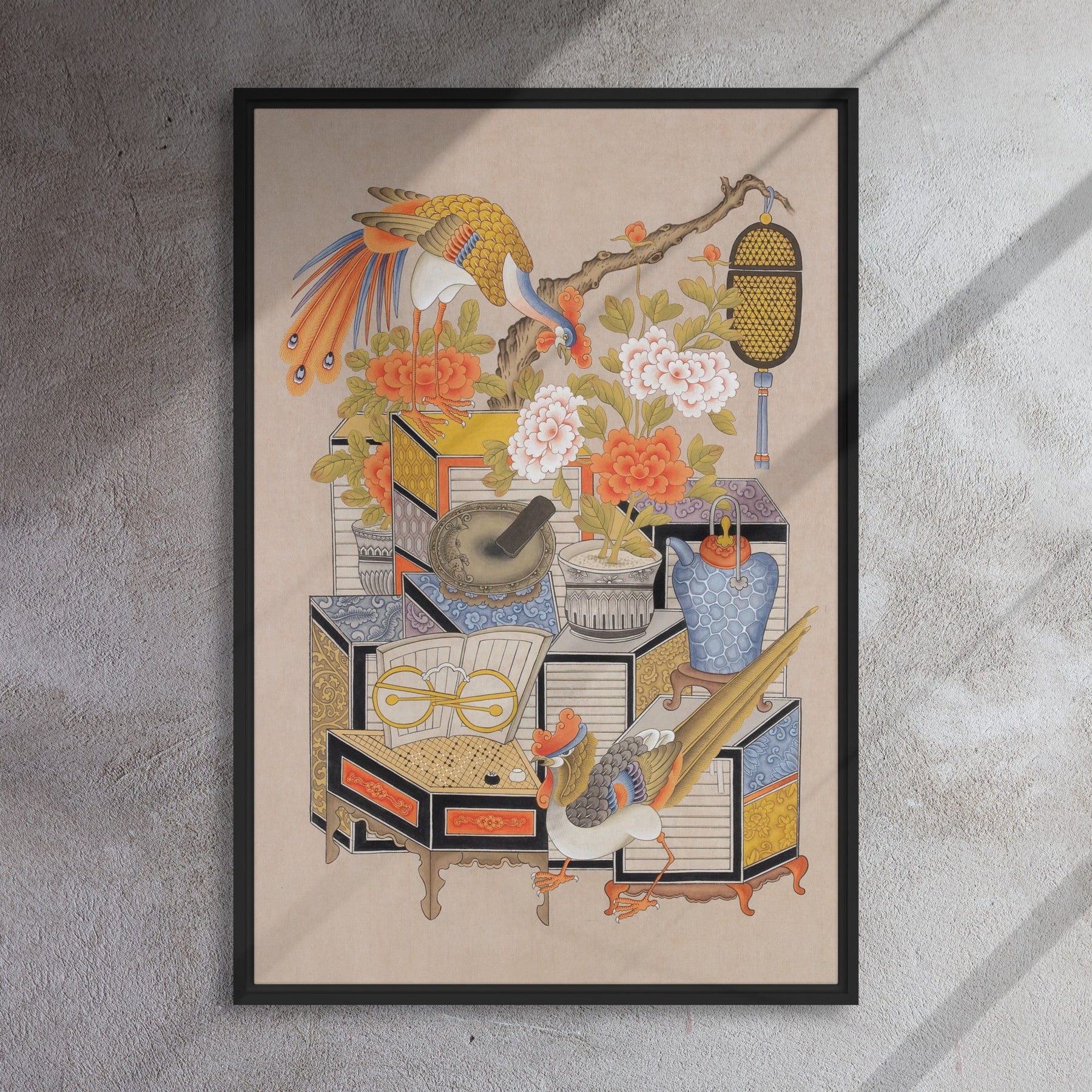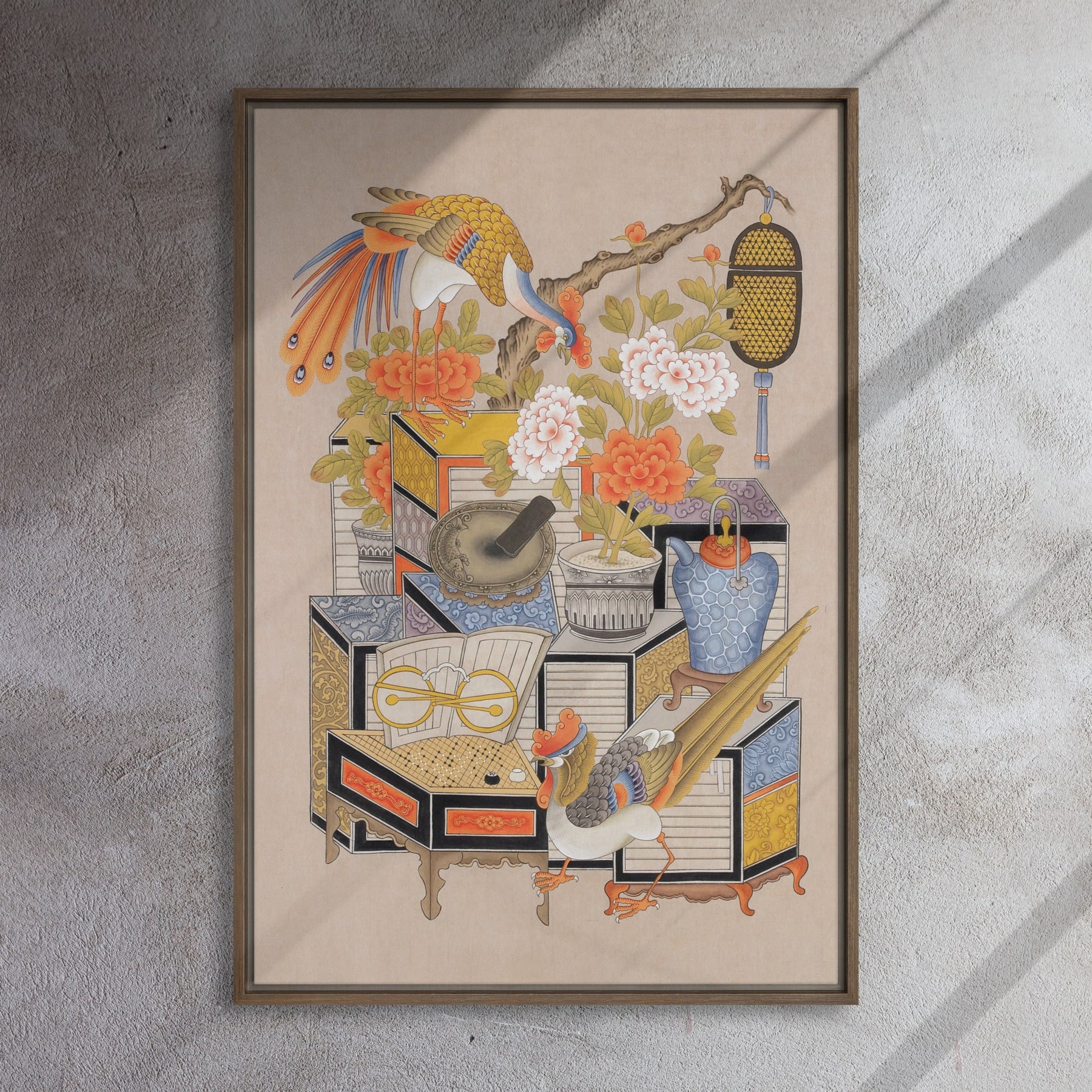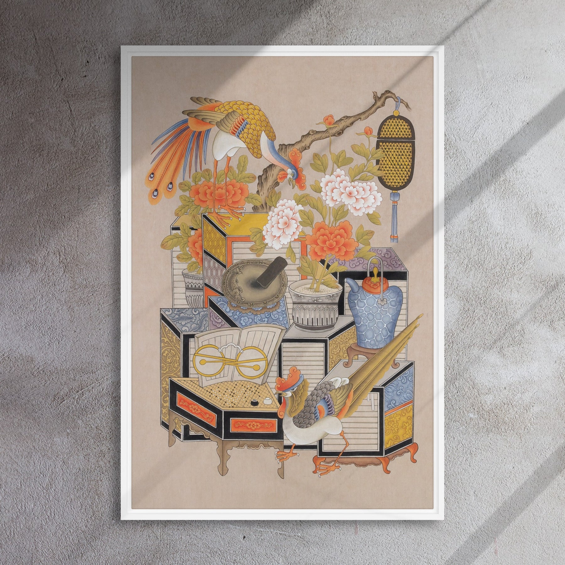 Diese Leinwandarbeit interpretiert das klassische Chaekgeori-Motiv neu.