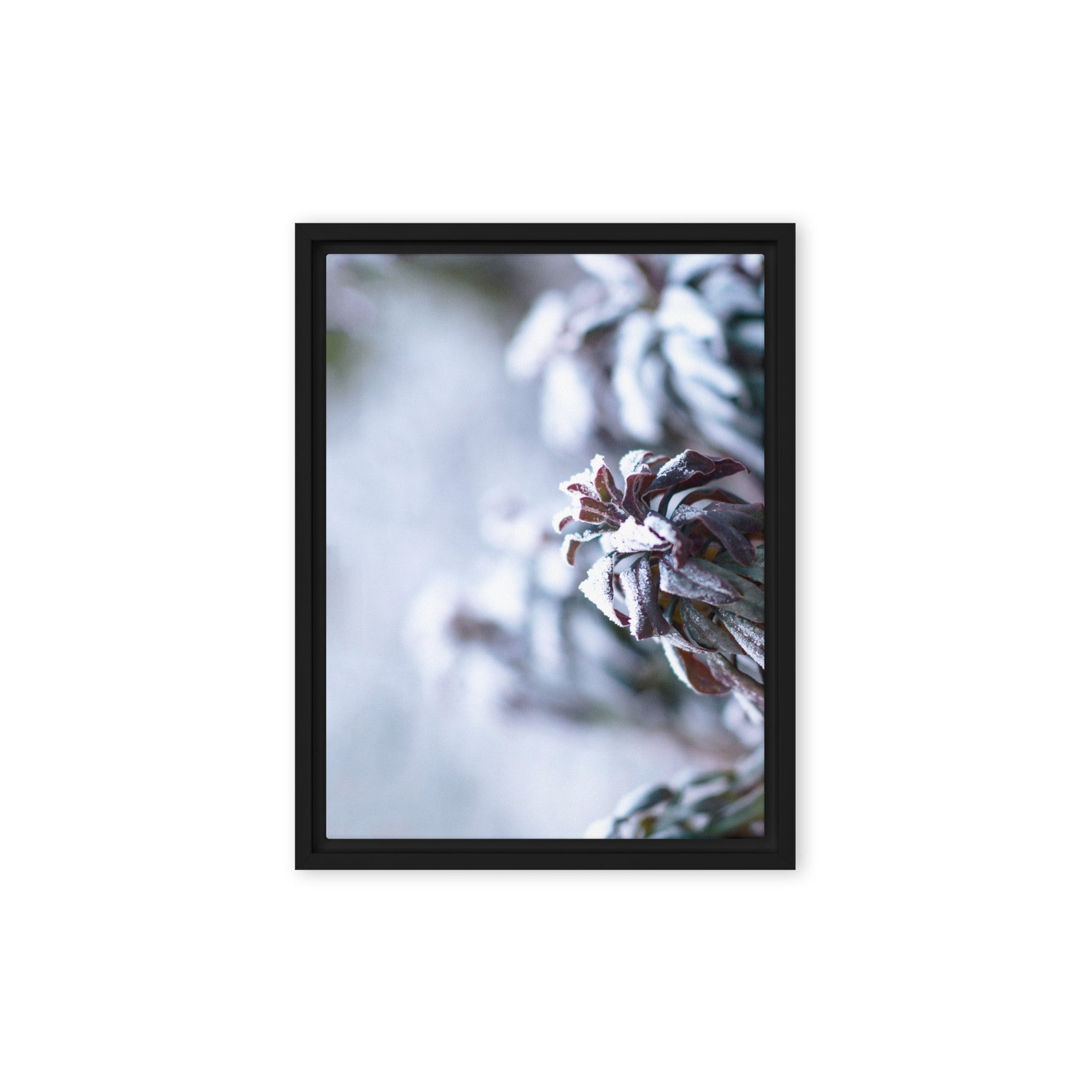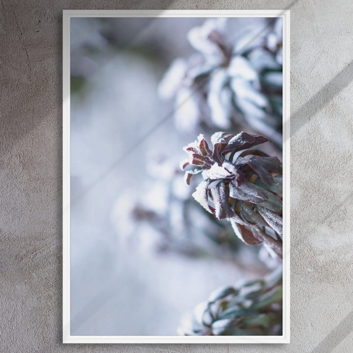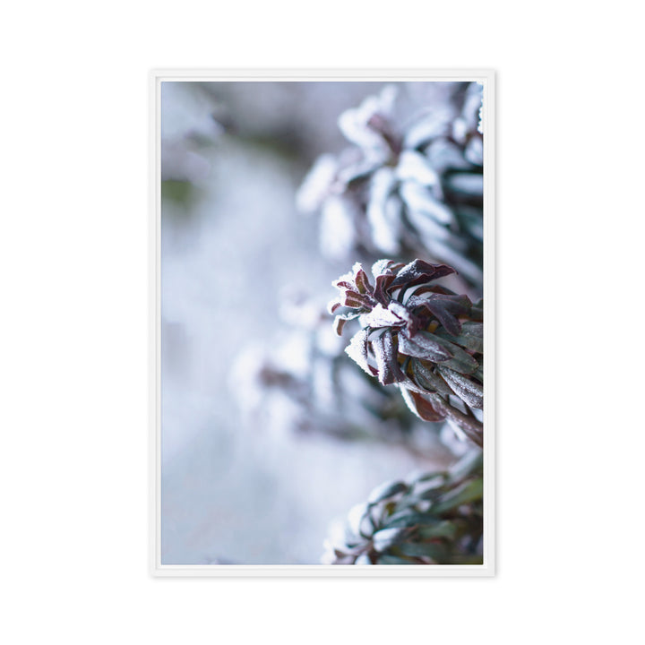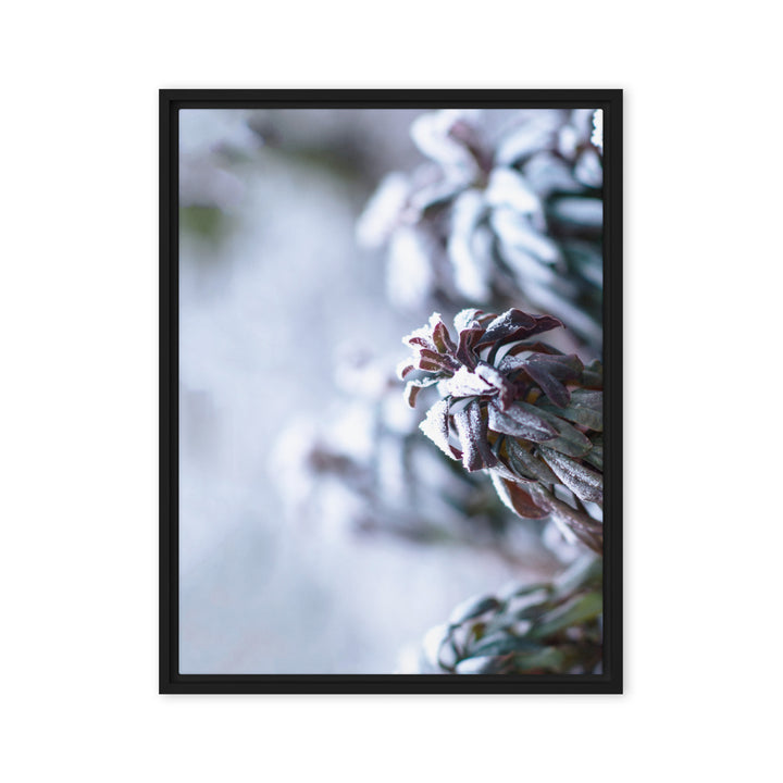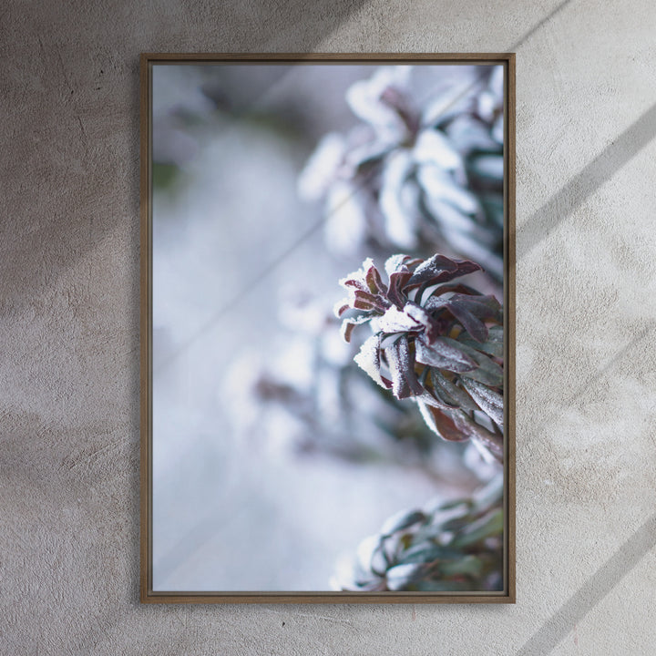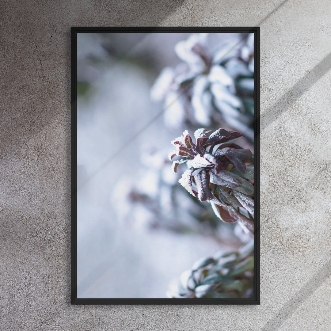 Gerahmte Leinwand - Frost on leaves, a moment in nature