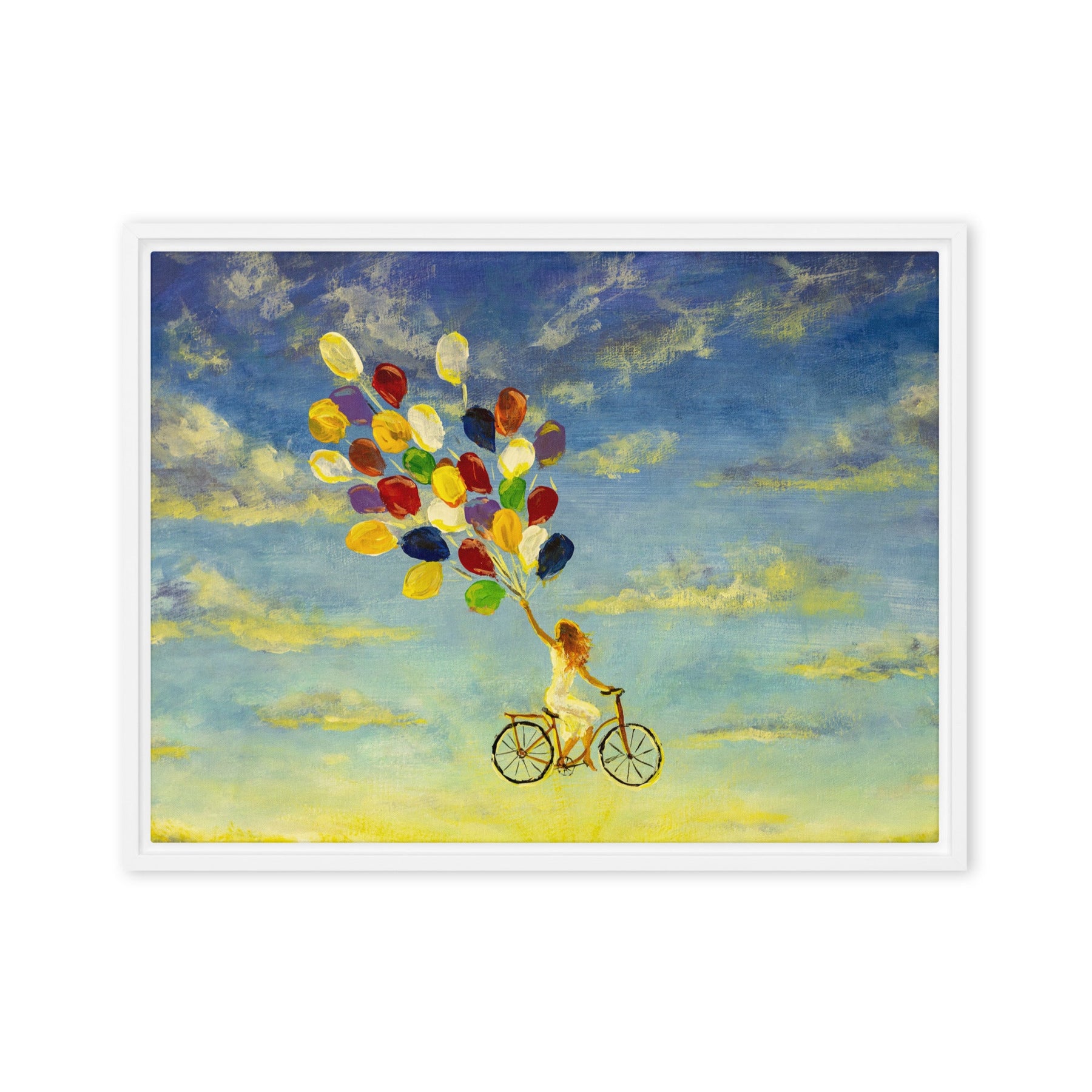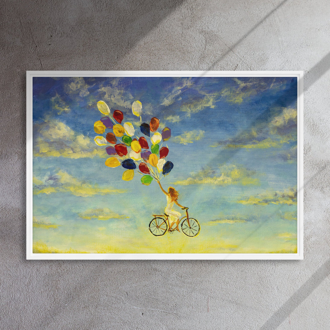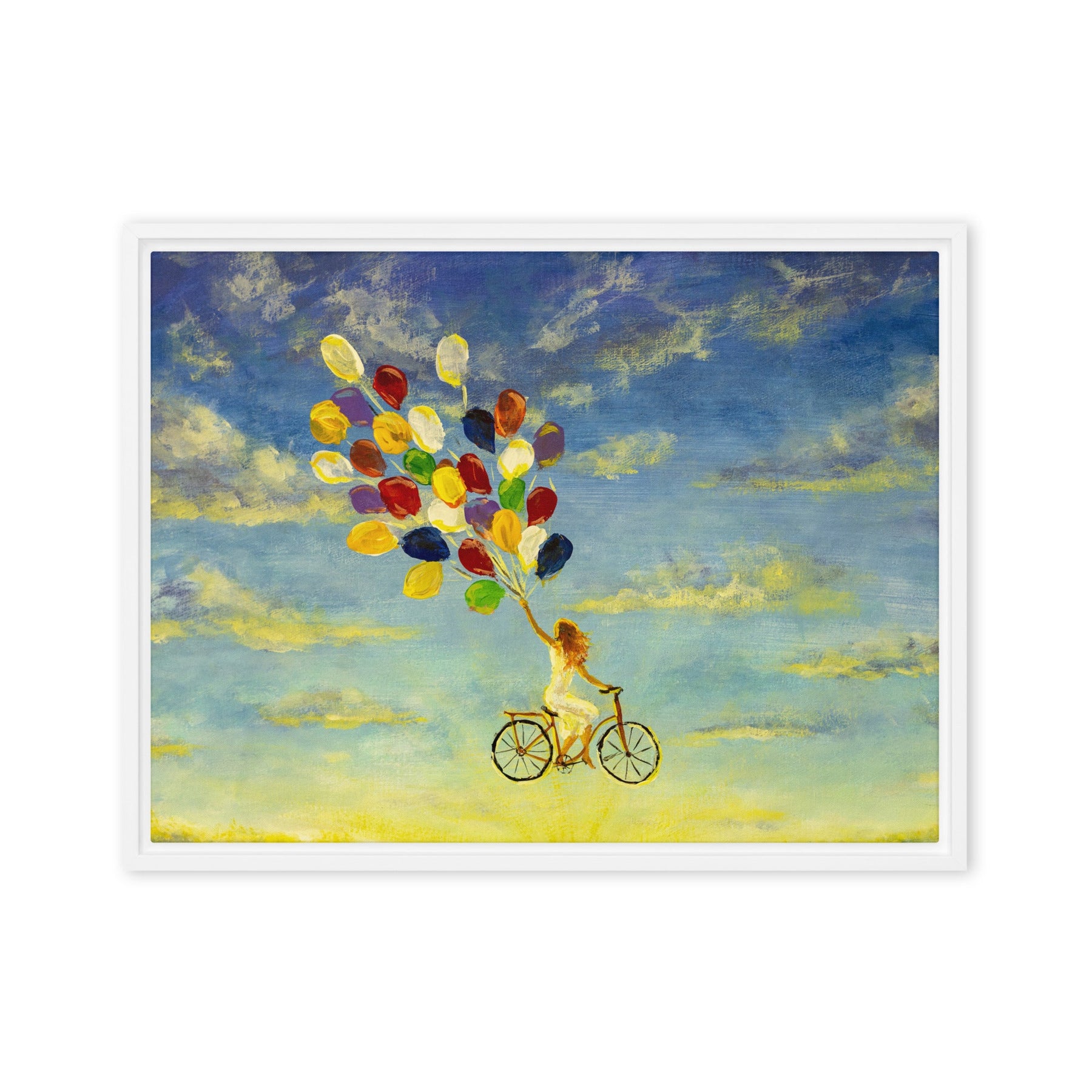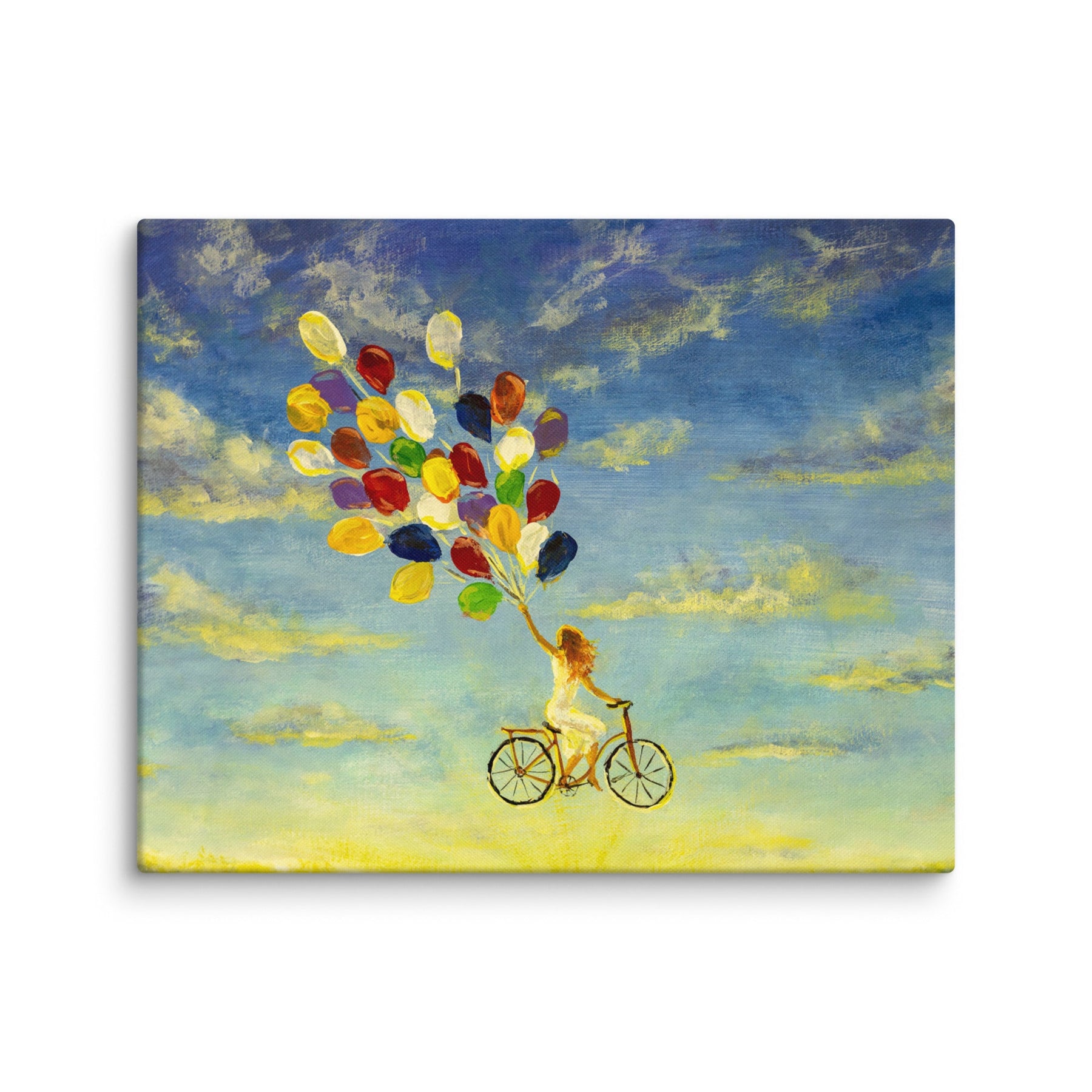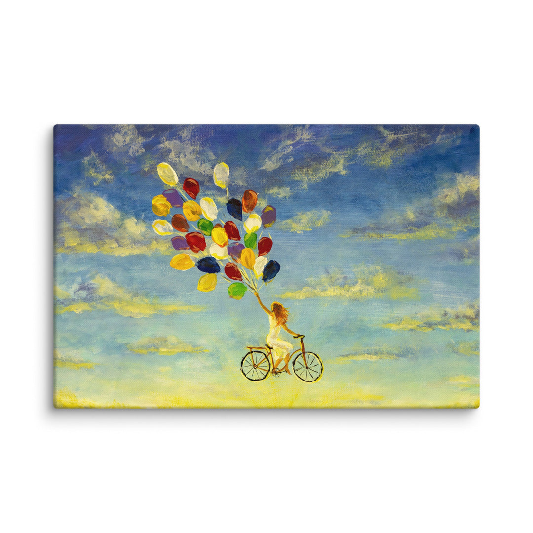 Dieses auf Leinwand gedruckte Wandbild „Luftballons am Himmel“ zeigt eine geradezu märchenhafte Szene. Wir sehen eine Frau, in einem weißen Kleid, die auf einem Fahrrad durch den blauen Himmel fliegt. Sie wird von dutzenden bunten Ballons getragen, die über ihr in der Luft schweben. Im Hintergrund sehen wir vereinzelt Wolken, die von der Sonne angestrahlt werden. Wir wissen nicht, ob die Sonne unter- oder aufgeht, doch trotz des simplen Motivs schafft es „Luftballons am Himmel“ das wohlige Gefühl von Träumen und Märchen in uns zu erzeugen. Wir können uns einfach vorstellen über grüne Wiesen oder sanfte Wellen zu fliegen, die von einer wärmenden Sonne erleuchtet werden, während uns ein angenehmer Wind um die Nase weht. Es ist eine traumhafte Szenerie.