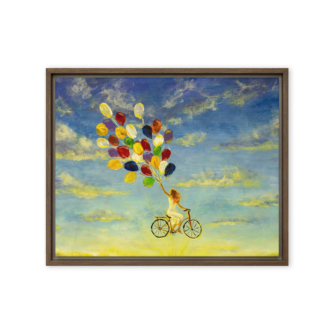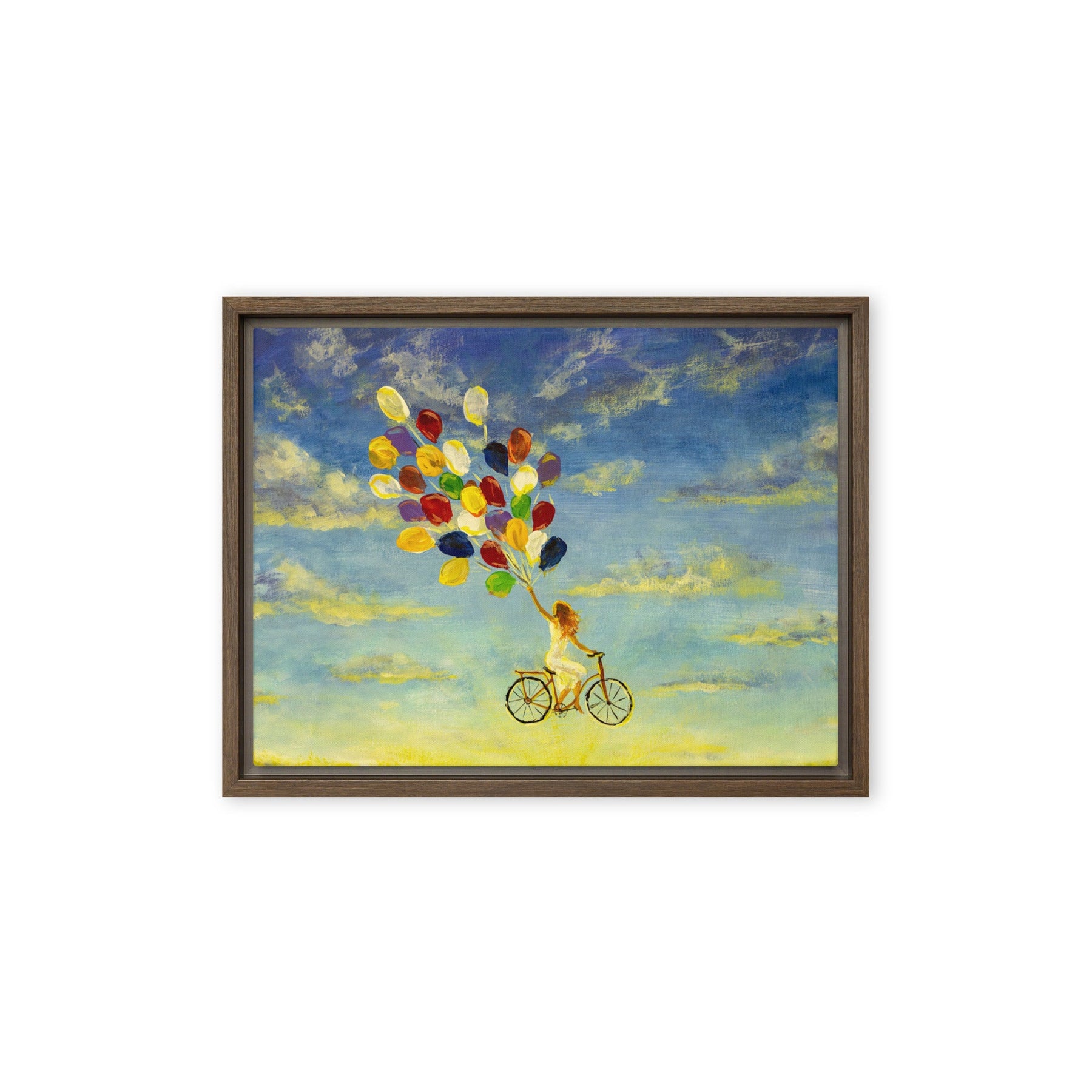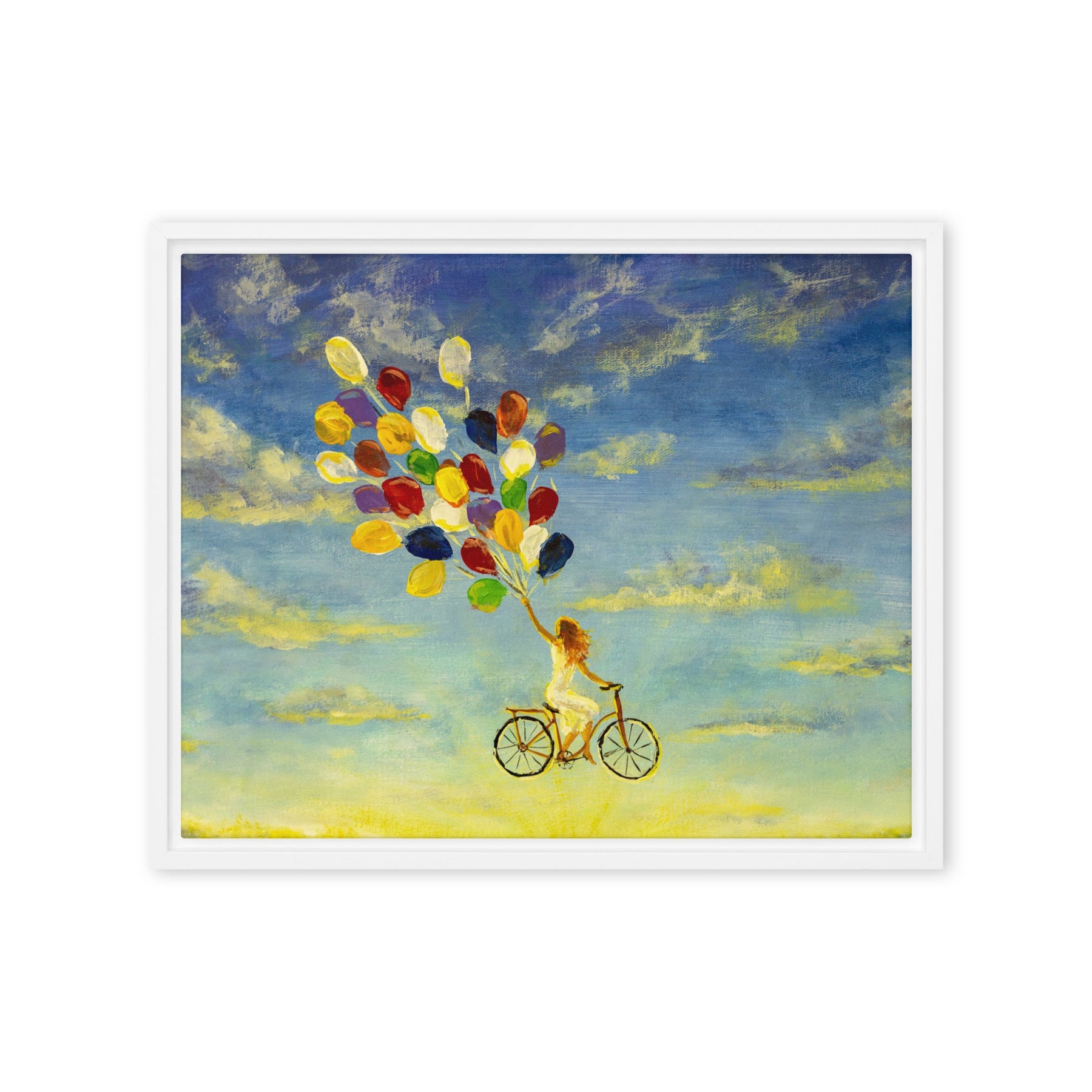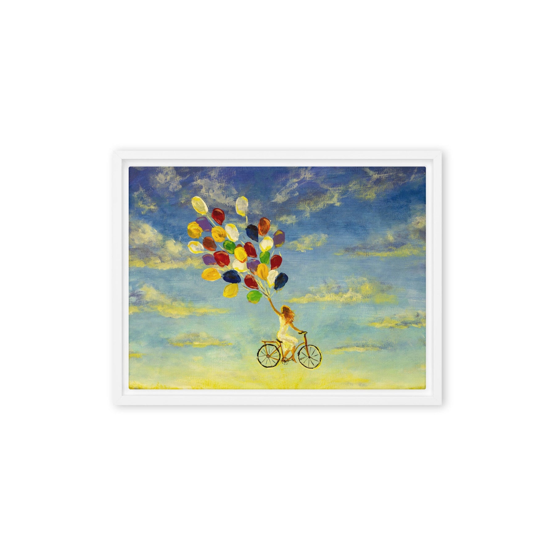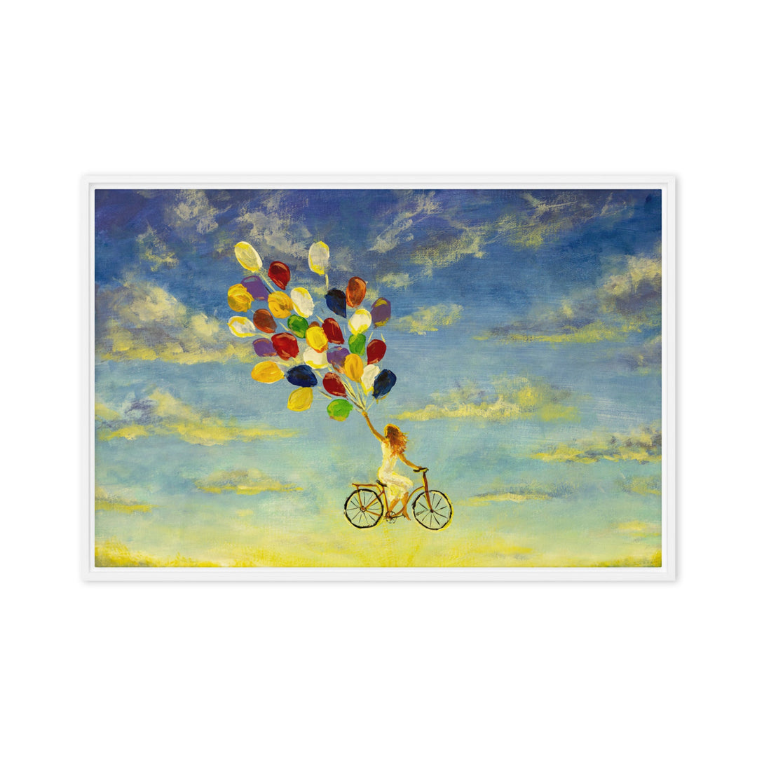 Dieses auf Leinwand gedruckte Wandbild „Luftballons am Himmel“ zeigt eine geradezu märchenhafte Szene. Wir sehen eine Frau, in einem weißen Kleid, die auf einem Fahrrad durch den blauen Himmel fliegt. Sie wird von dutzenden bunten Ballons getragen, die über ihr in der Luft schweben. Im Hintergrund sehen wir vereinzelt Wolken, die von der Sonne angestrahlt werden. Wir wissen nicht, ob die Sonne unter- oder aufgeht, doch trotz des simplen Motivs schafft es „Luftballons am Himmel“ das wohlige Gefühl von Träumen und Märchen in uns zu erzeugen. Wir können uns einfach vorstellen über grüne Wiesen oder sanfte Wellen zu fliegen, die von einer wärmenden Sonne erleuchtet werden, während uns ein angenehmer Wind um die Nase weht. Es ist eine traumhafte Szenerie.