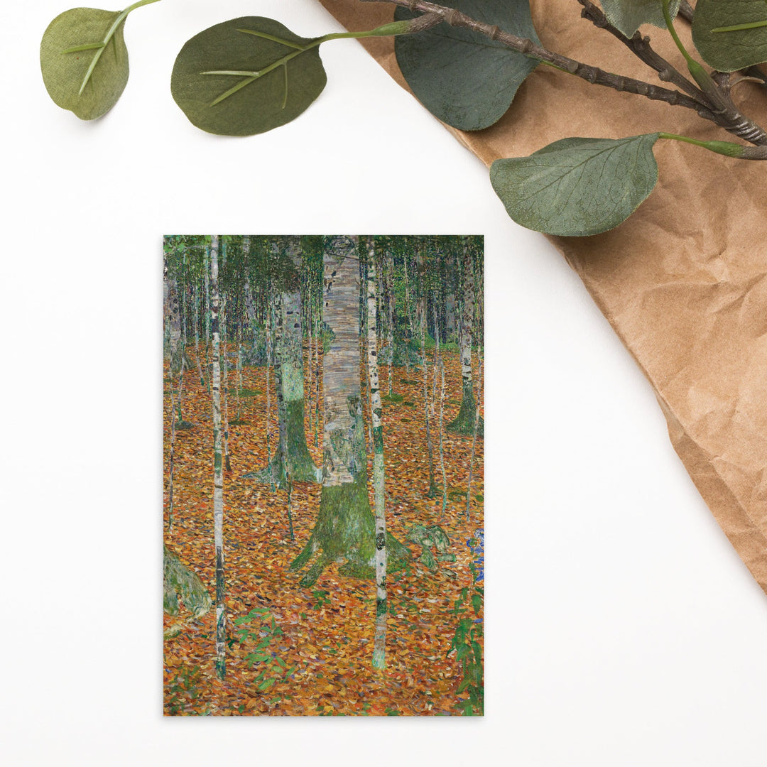 Diese Postkarte - Gustav Klimt, Birkenwald wird aus dickem, hochwertigem mattem Papier hergestellt, sodass sie sich als optimales Geschenk oder für eine liebevolle Nachricht an einen Freund eignen.